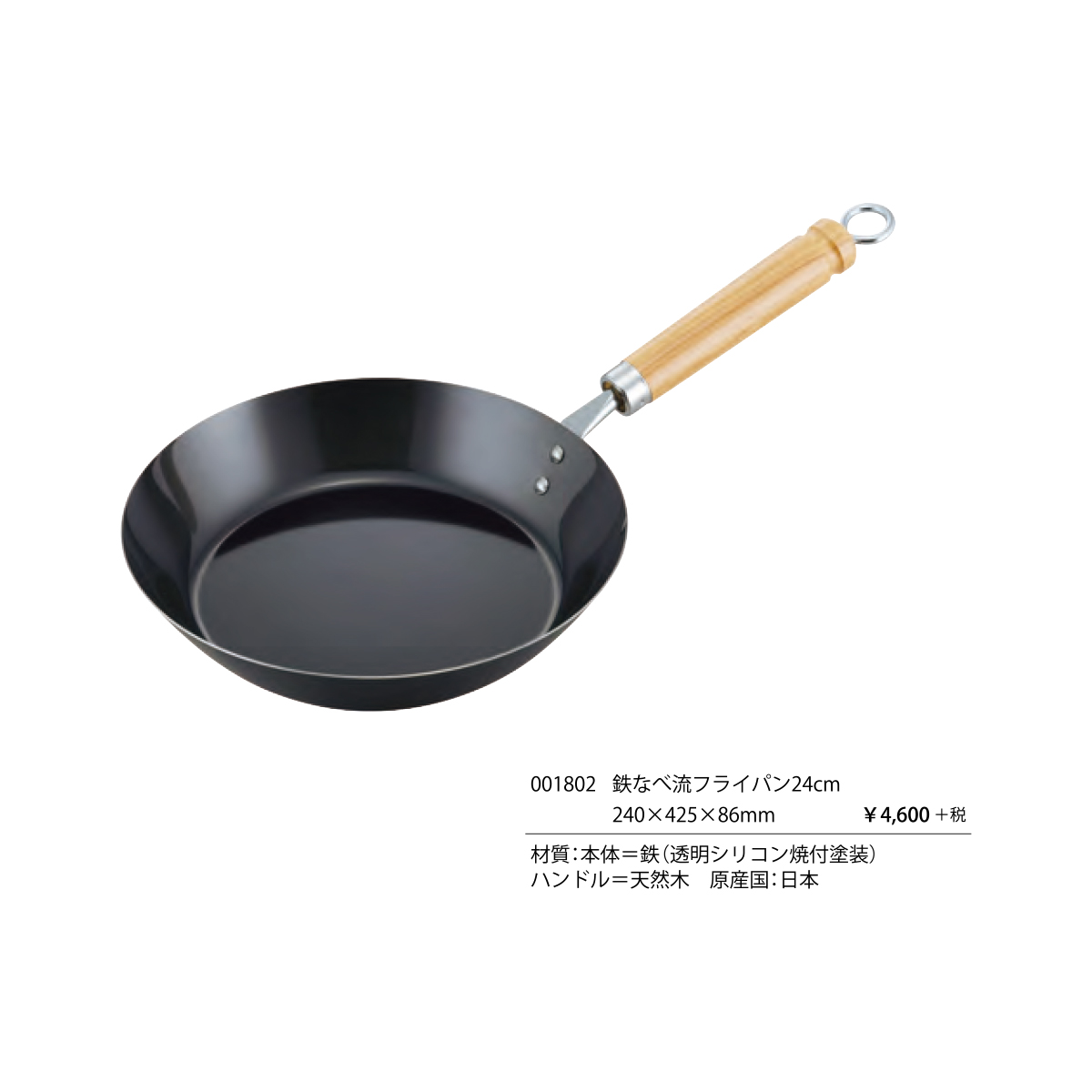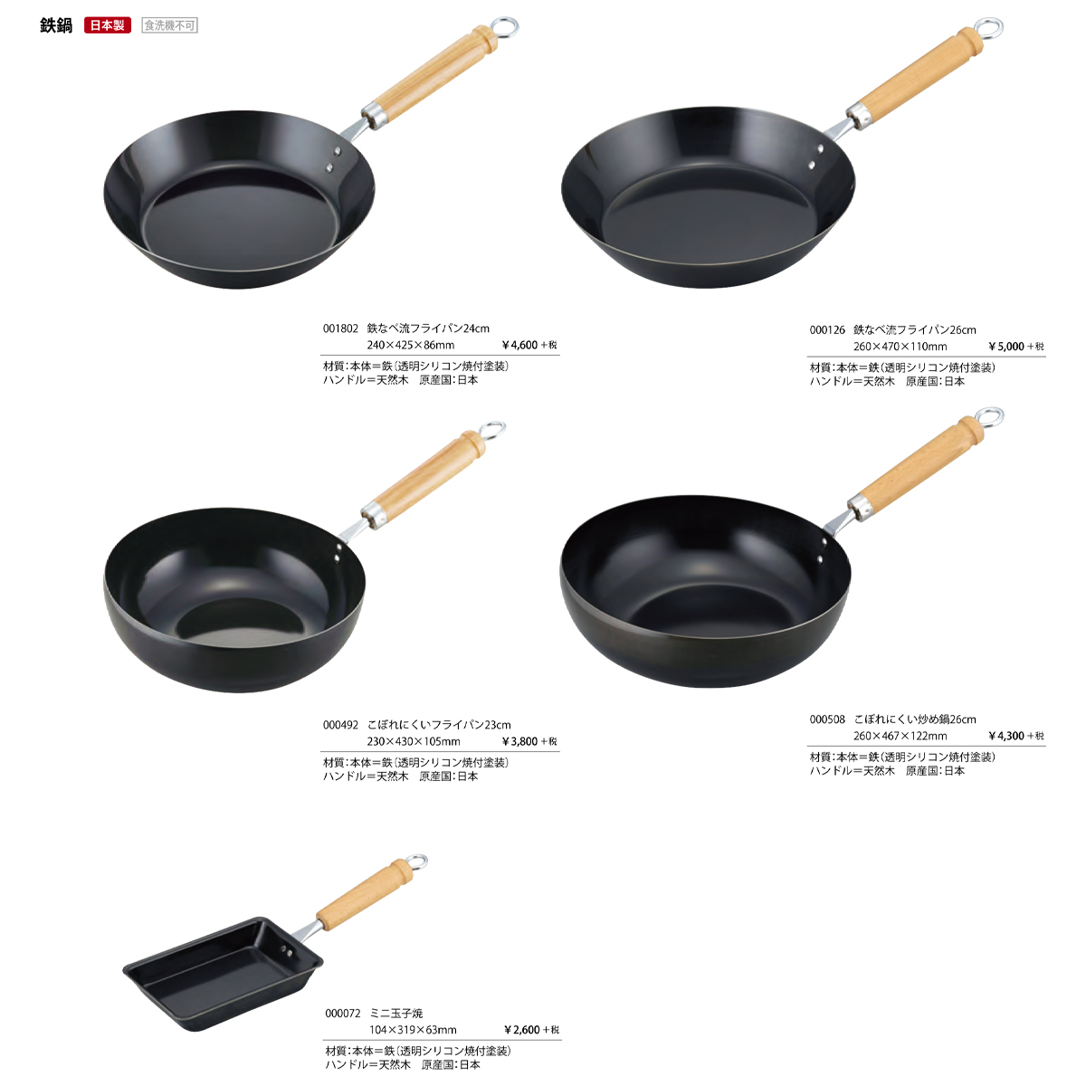 | サイズ | 鉄なべ流フライパン24cm : 240×425×86mm 鉄なべ流フライパン26cm : 260×470×110mm こぼれにくいフライパン23cm : 230×430×105mm こぼれにくい炒め鍋26cm : 260×467×122mm ミニ玉子焼 : 104×319×63mm |