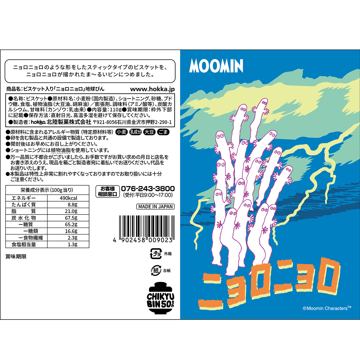 ニョロニョロのような形をしたスティックタイプのビスケットを、ニョロニョロが描かれたま〜るいビンにつめました。