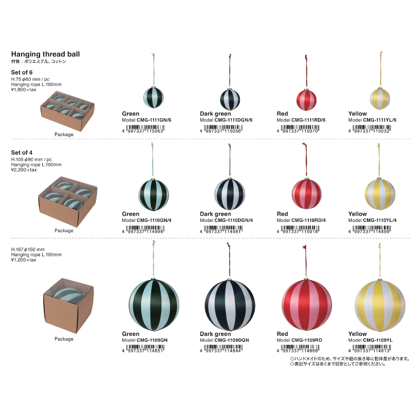| サイズ | 【HANGING THREAD BALL Set of 6】 H.75 Φ60mm / pc Hanging rope L.100mm 【HANGING THREAD BALL Set of 4】 H.105 Φ90mm / pc Hanging rope L.100mm 【HANGING THREAD BALL】 H.105 Φ90mm / pc Hanging rope L.100mm |
