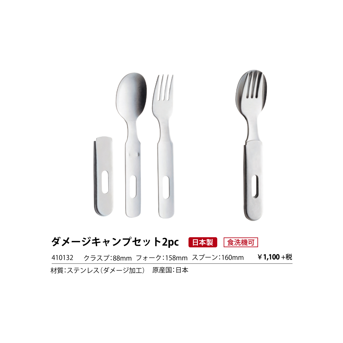 | サイズ | 2pc:クラスプ=88mm、フォーク=158mm、スプーン=160mm 3pc:フォーク=158mm、スプーン=160mm、ナイフ=164mm |