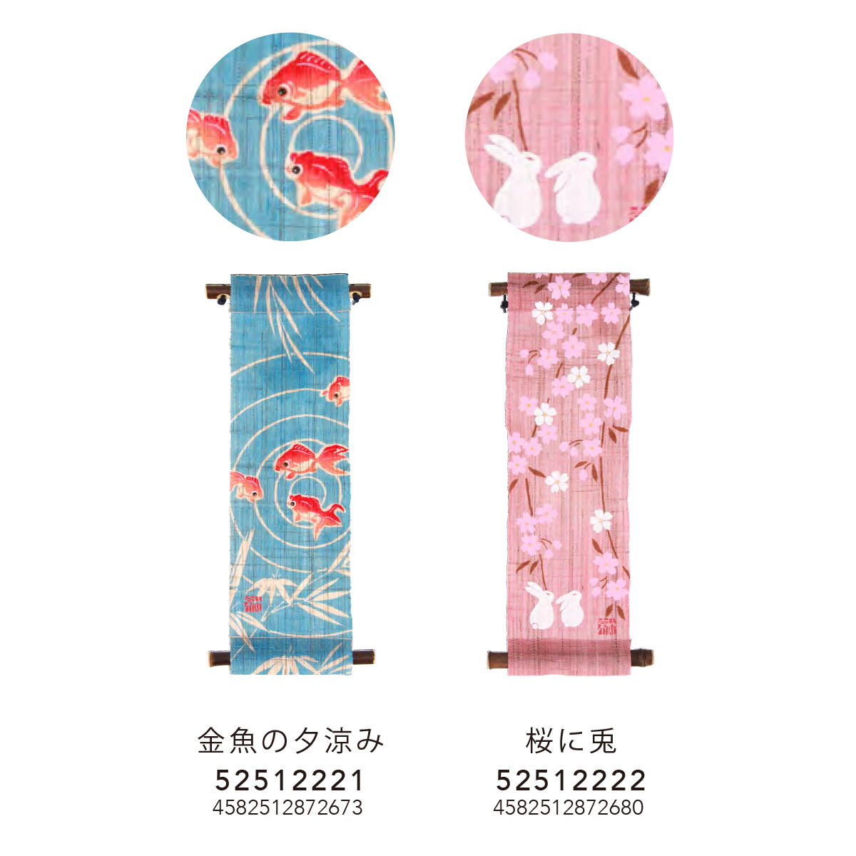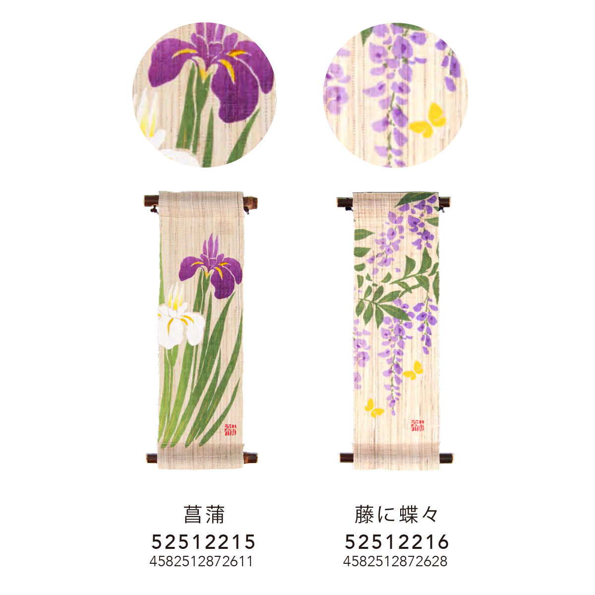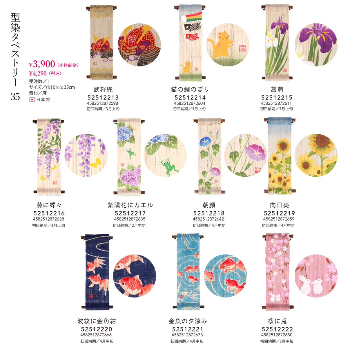 季節の草花や動物をあしらった、細身で飾りやすい型染タペストリーです。