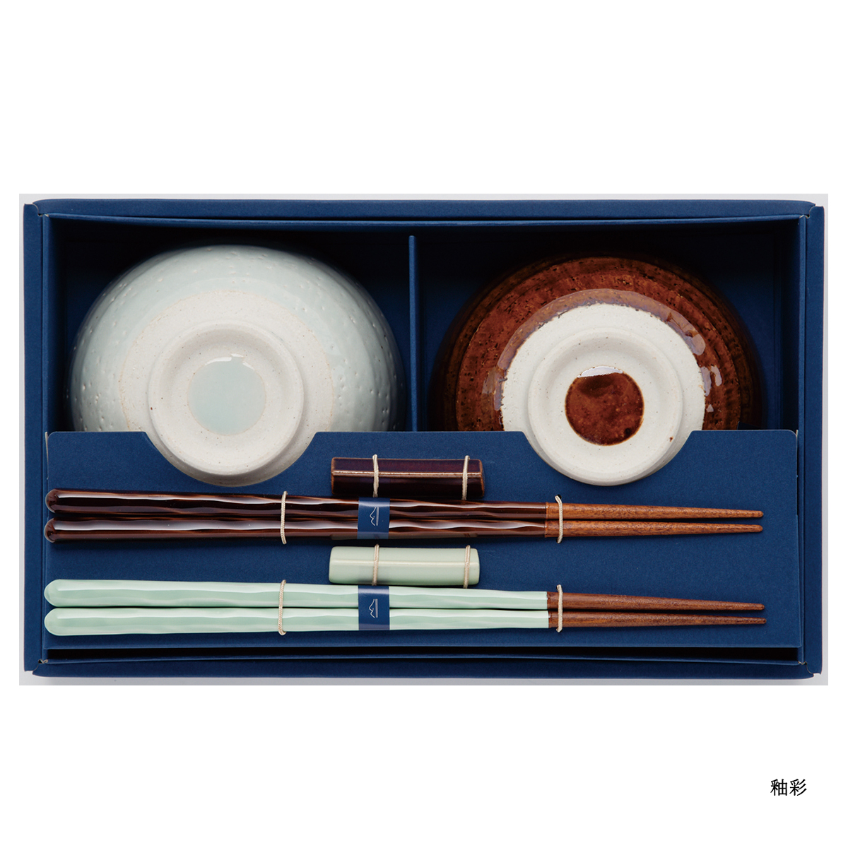 美濃焼の手作りの茶碗と若狭塗箸をオリジナルギフトボックスでお届けします。