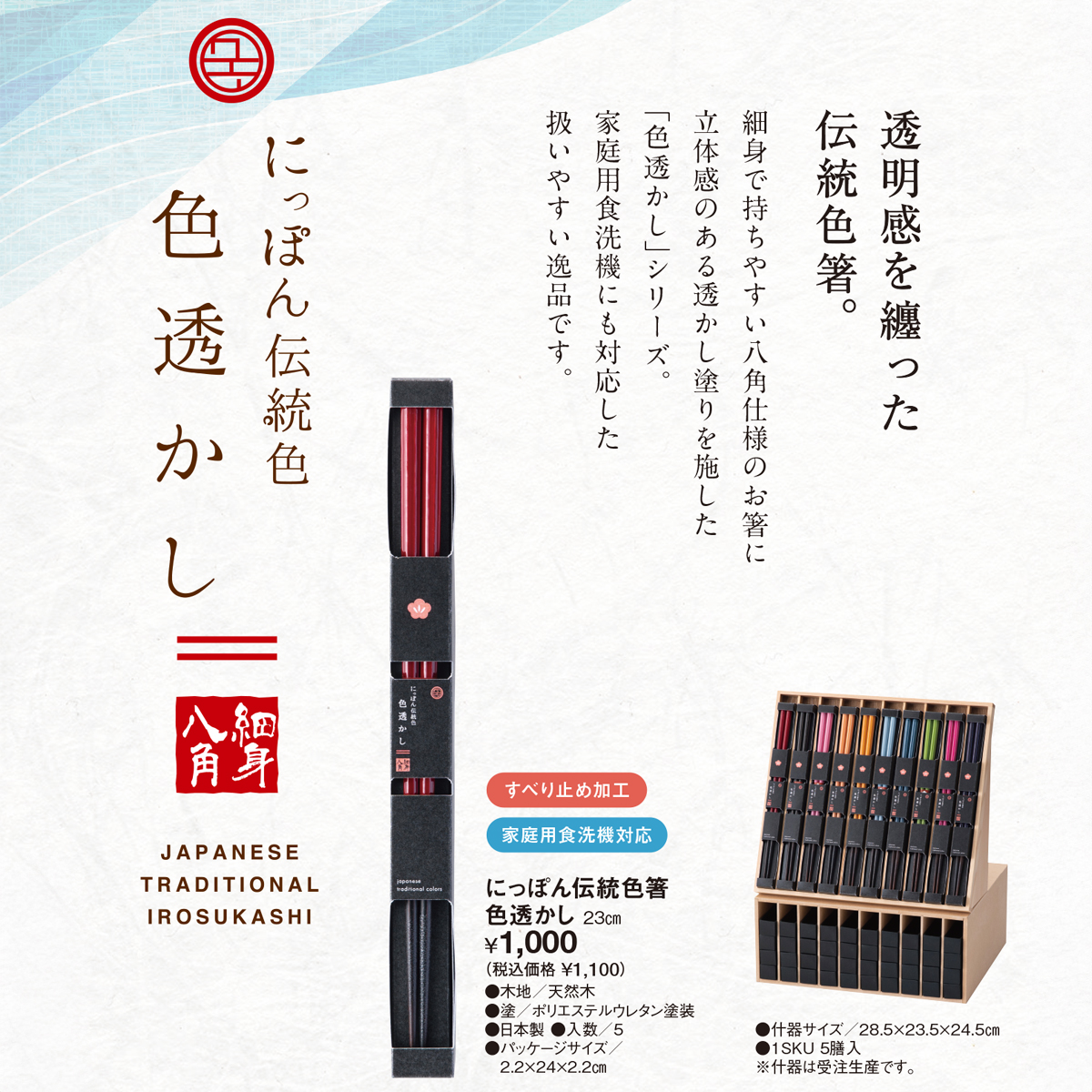 細身で持ちやすい八角仕様のお箸に、立体感ある透かし塗りを施した「色透かし」シリーズ。