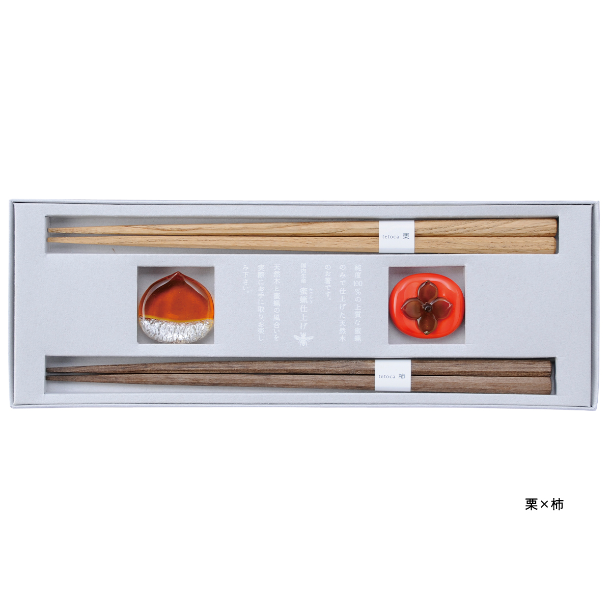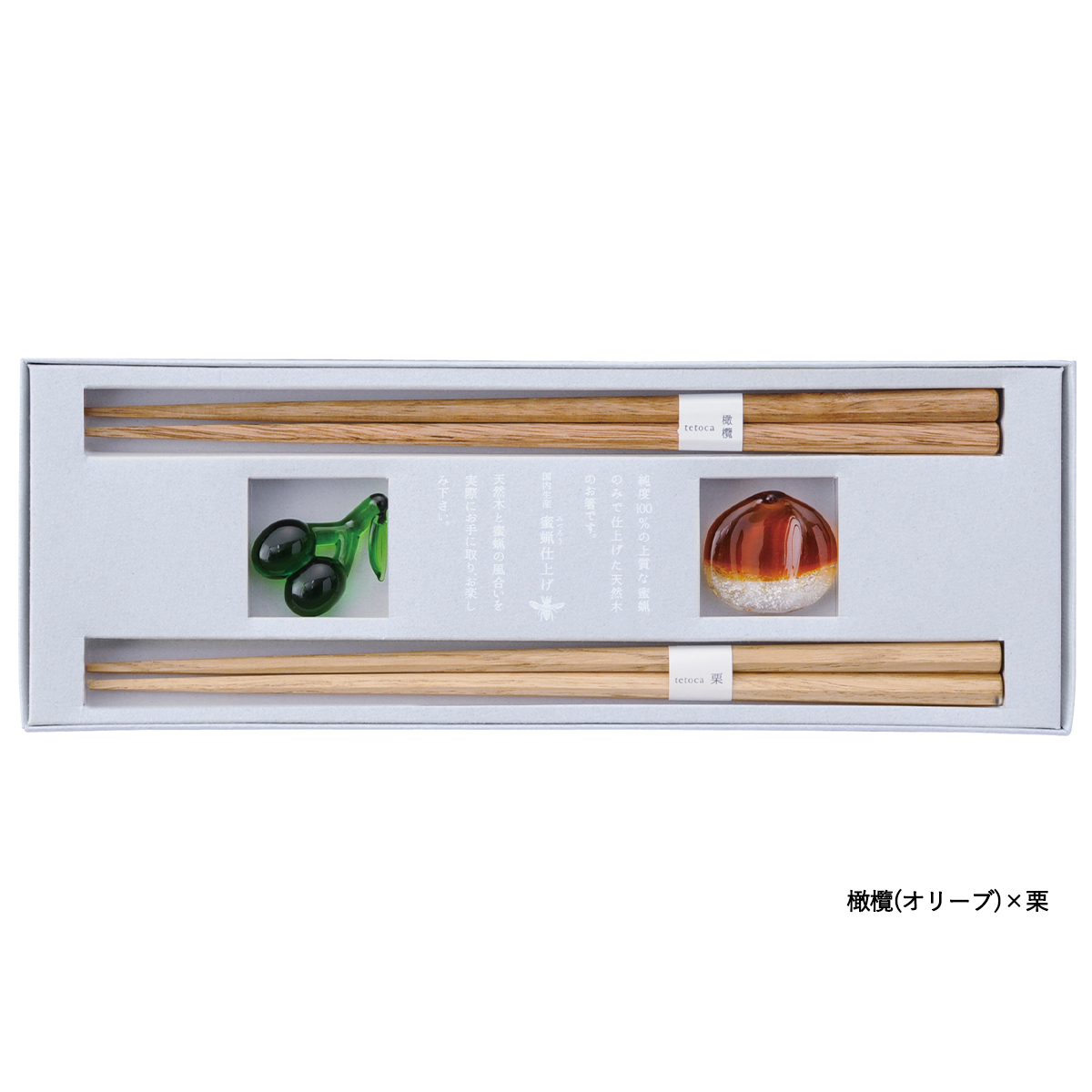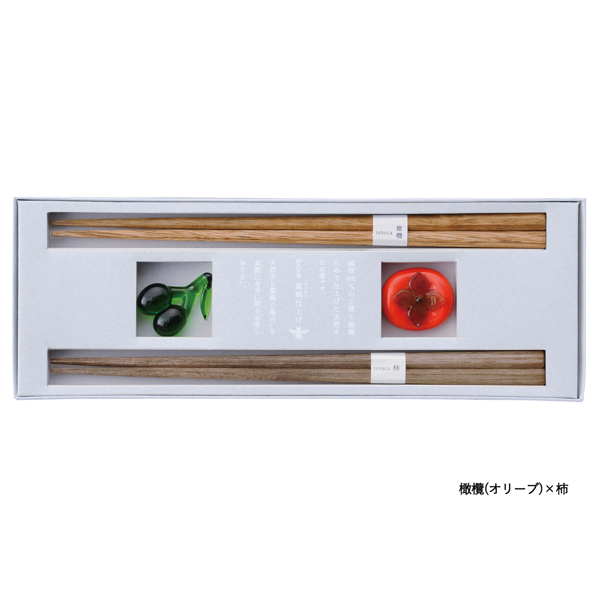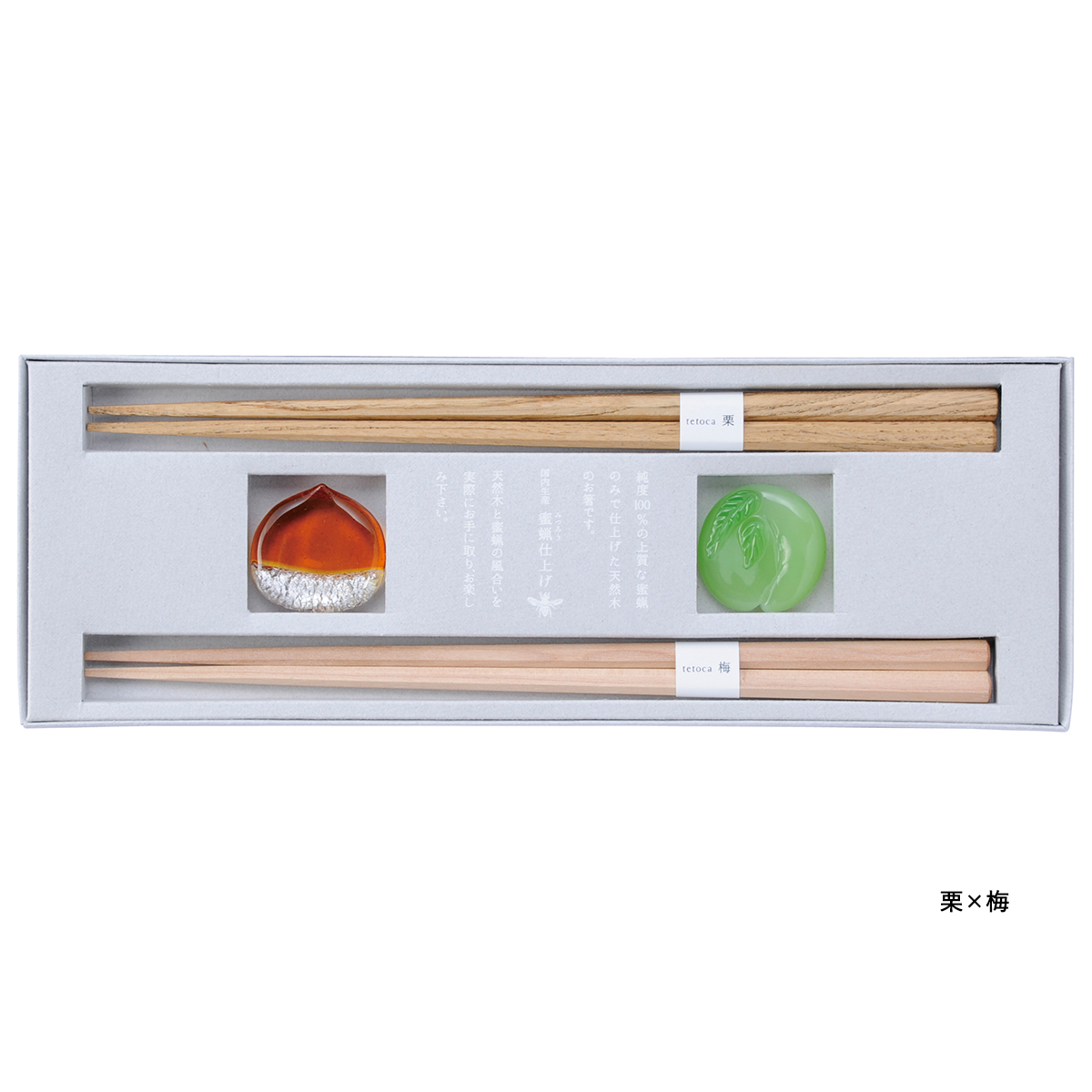 | 素材 | 箸(木地:天然木)、箸置き(ソーダガラス)、塗/みつろう塗装 |