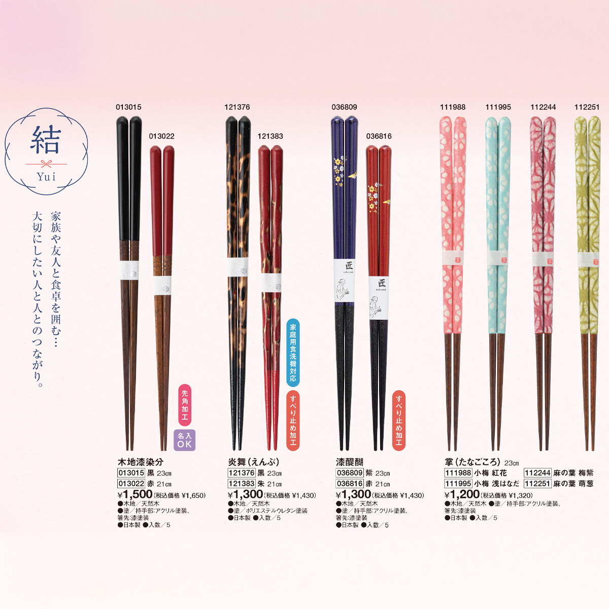 | 素材 | 【木地漆染分、漆醒醐、掌、漆ローザンス】 木地/天然木、塗/持手部:アクリル塗装、箸先:漆塗装 【炎舞、月映え、漣、夢花】 木地/天然木、塗/ポリエステルウレタン塗装 |