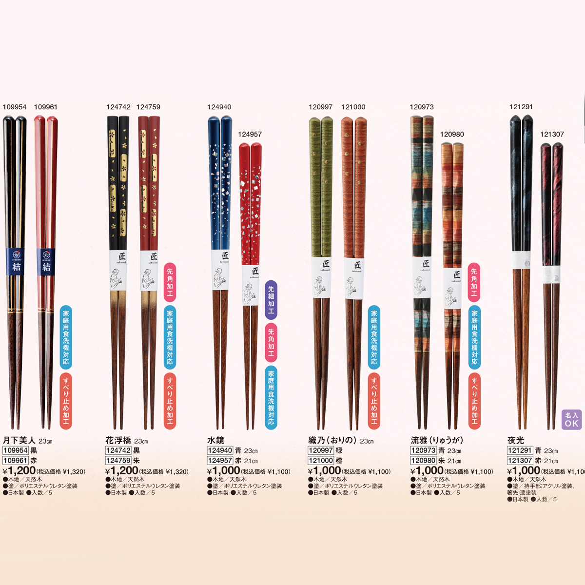 | 素材 | 【ネオ鎌倉、散沙雨、夜光】 木地/天然木、塗/持手部:アクリル塗装、箸先:漆塗装 【沈丁花、レリーフ、花嵐、月下美人、花浮橋、水鏡、織乃、流雅】 木地/天然木、塗/ポリエステルウレタン塗装 |