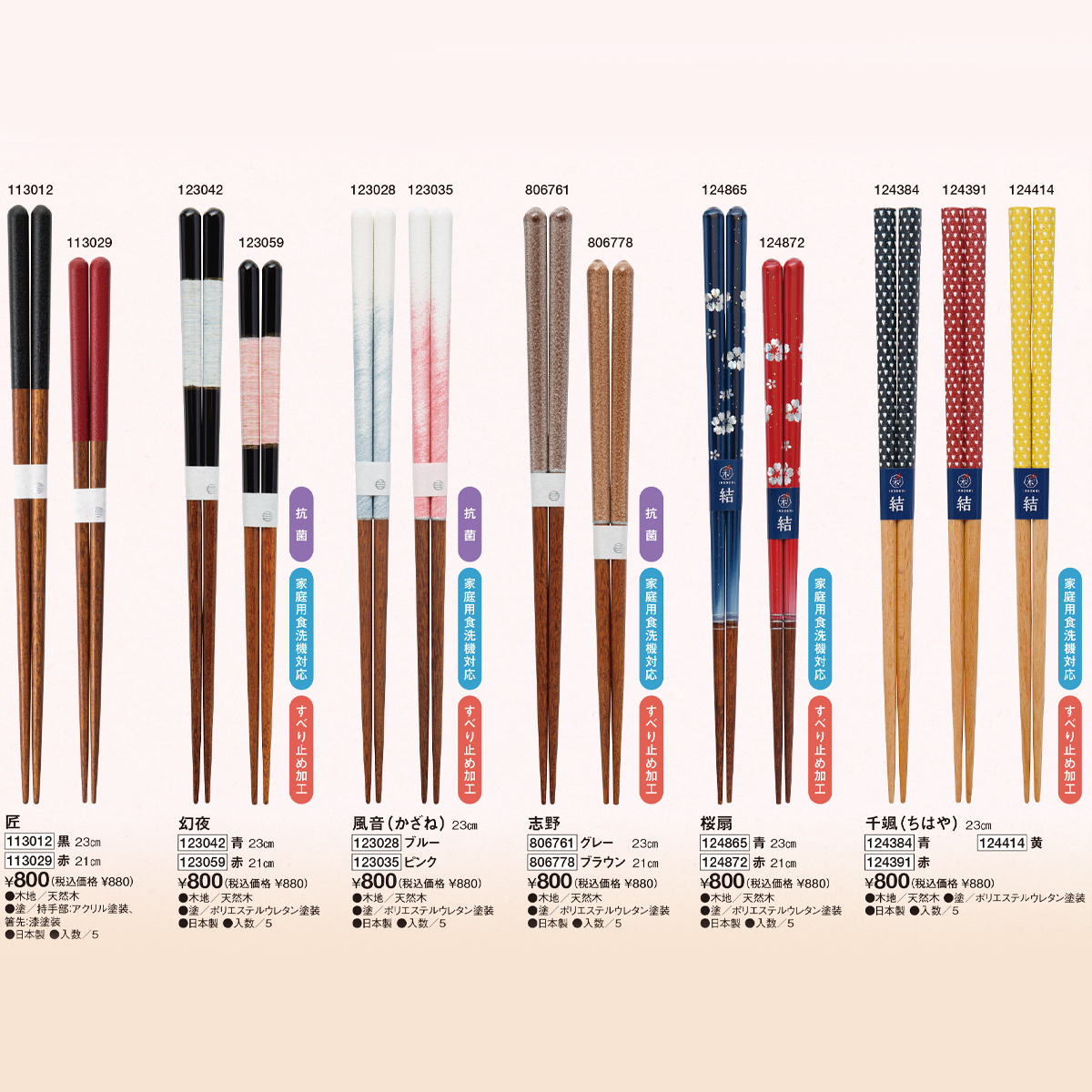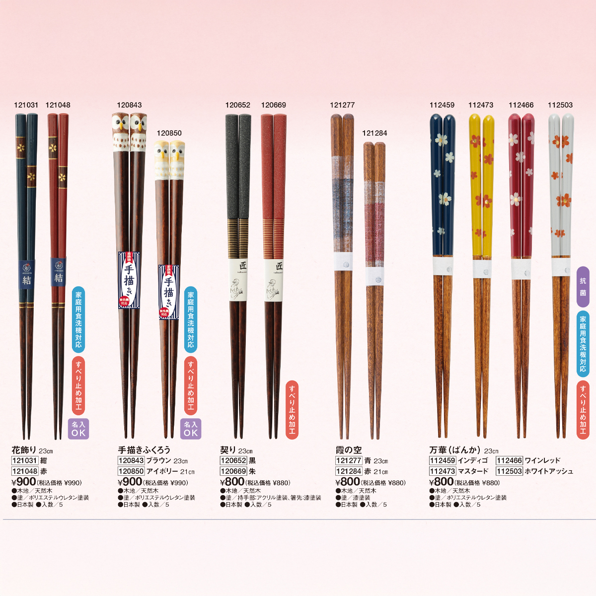 | 素材 | 【契り、匠】 木地/天然木、塗/持手部:アクリル塗装、箸先:漆塗装 【霞の空】 木地/天然木、塗/漆塗装 【花飾り、手描きふくろう、万華、幻夜、風音、志野、桜扇、千颯】 木地/天然木、塗/ポリエステルウレタン塗装 |