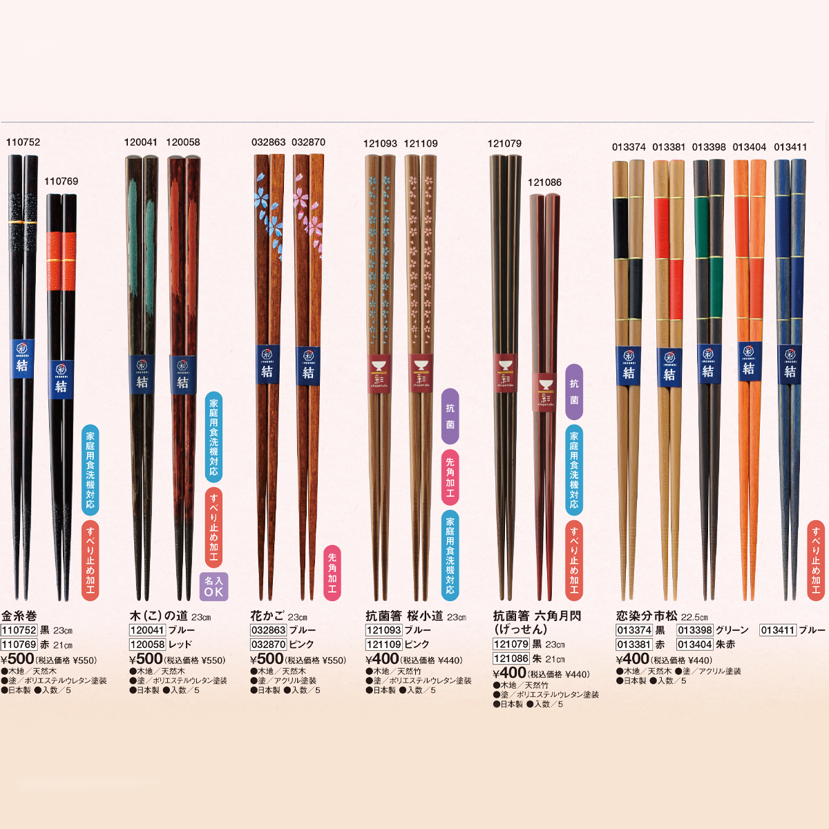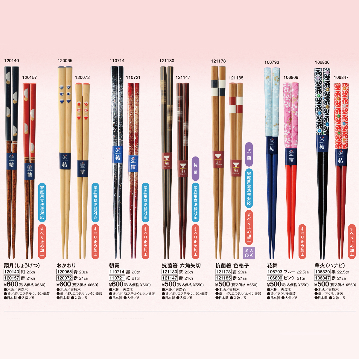 | 素材 | 【花舞、華火、花かご、恋染分市松】 木地/天然木、塗/アクリル塗装 【翔月、おかわり、朝霧、抗菌箸 色格子、金糸巻、木(こ)の道】 木地/天然木、塗/ポリエステルウレタン塗装 【抗菌箸 六角矢切、抗菌箸 桜小道、抗菌箸 六角月閃】 木地/天然竹、塗/ポリエステルウレタン塗装 |