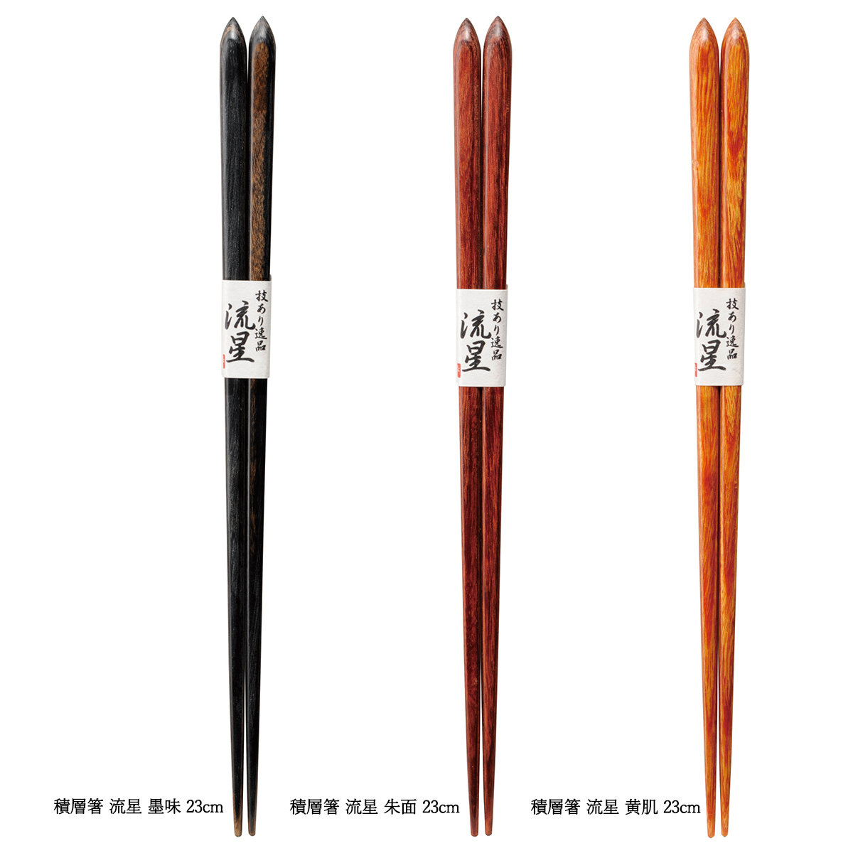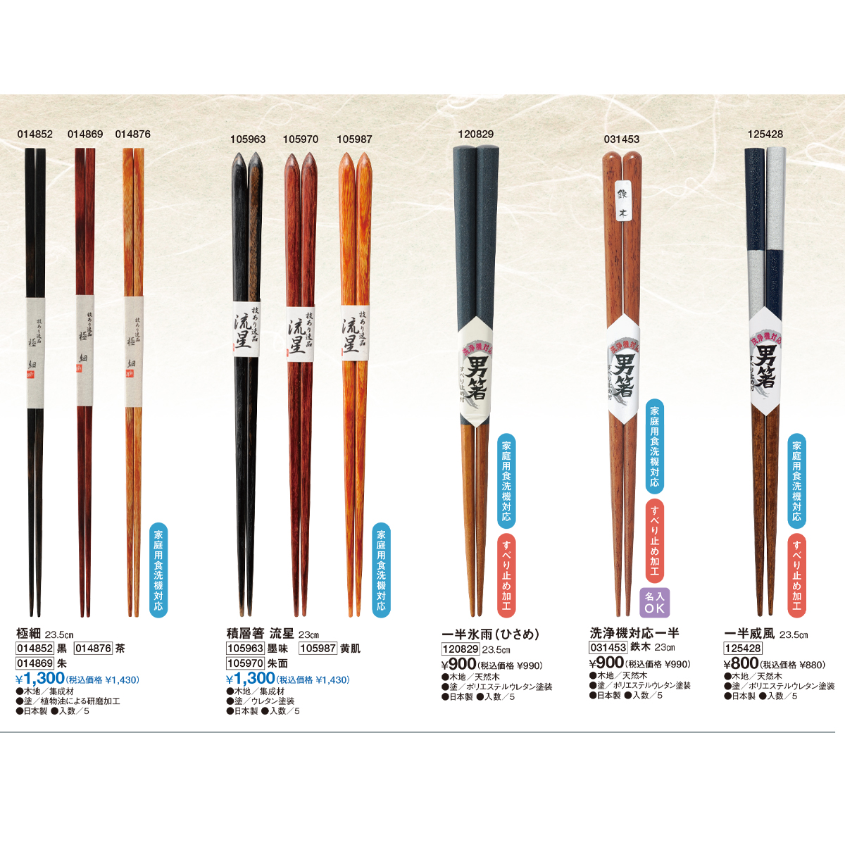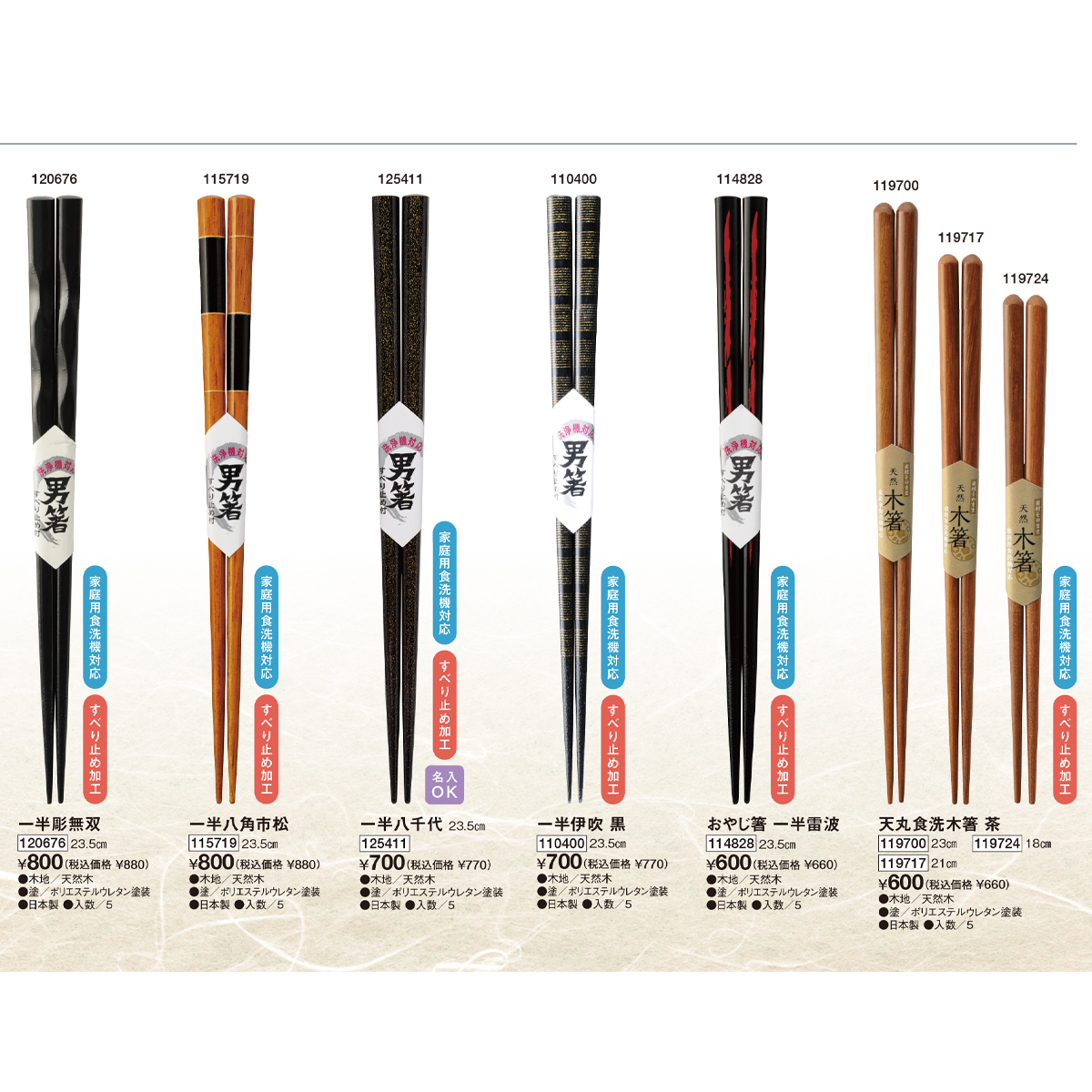 | 素材 | 【極細】 集成材、植物油による研磨加工 【積層箸 流星】 集成材、ウレタン塗装 【一半氷雨(ひさめ)、洗浄機対応一半、一半威風、一半彫無双、一半八角市松、一半八千代、一半伊吹、おやじ箸 一半雷波、天丸食洗木箸】 天然木、ポリエステルウレタン塗装 |