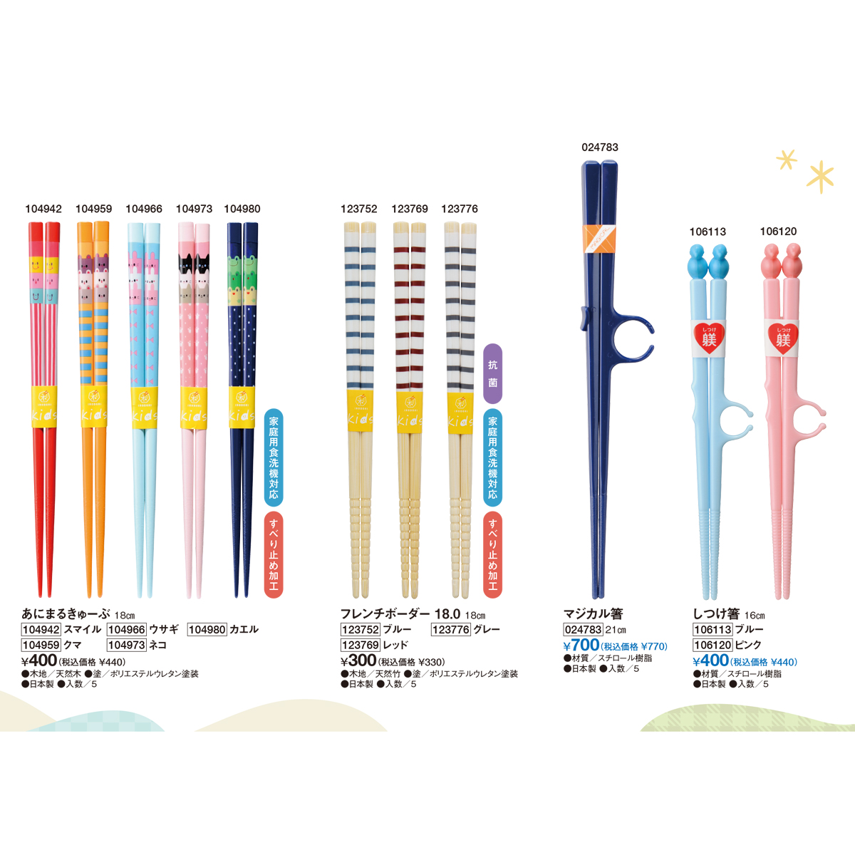 | 素材 | 【手描きふくろう、あにまるらんど、白木タータン、クック、あにまるきゅーぶ】 天然木、ポリエステルウレタン塗装 【フレンチボーダー 18.0】 天然竹、ポリエステルウレタン塗装 【マジカル箸、しつけ箸】 スチロール樹脂 |