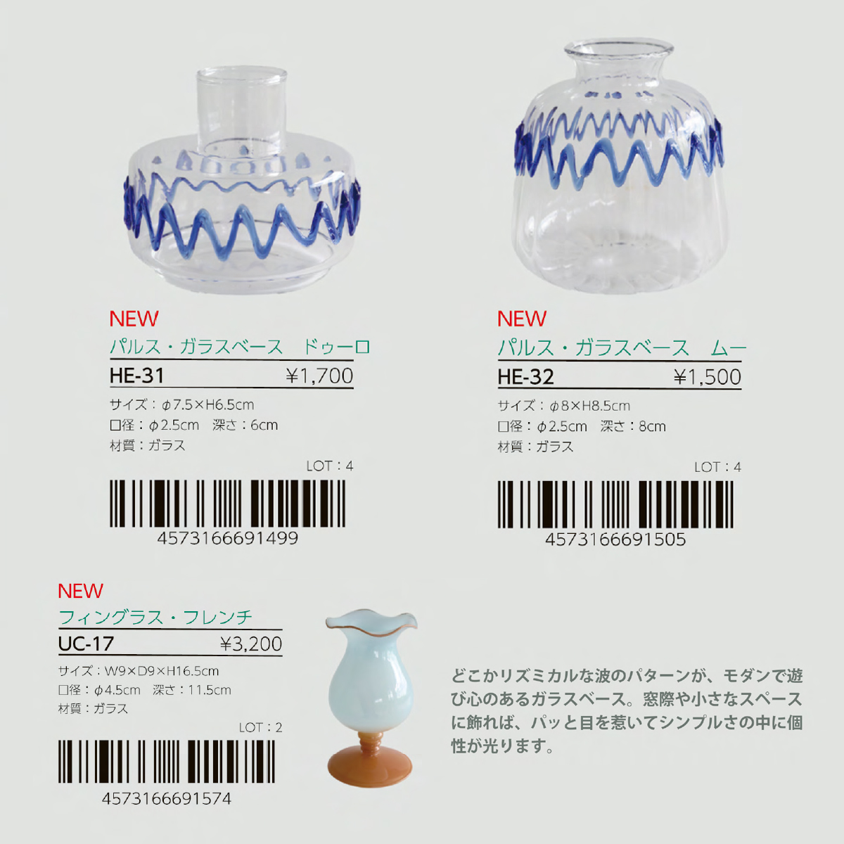 | サイズ | HE-31 パルス・ガラスベース ドゥーロ : W7.5×H6.5 HE-32 パルス・ガラスベース ムー : W8×H8.5 UC-17 フィングラス・フレンチ : W9×D9×H16.5 |
