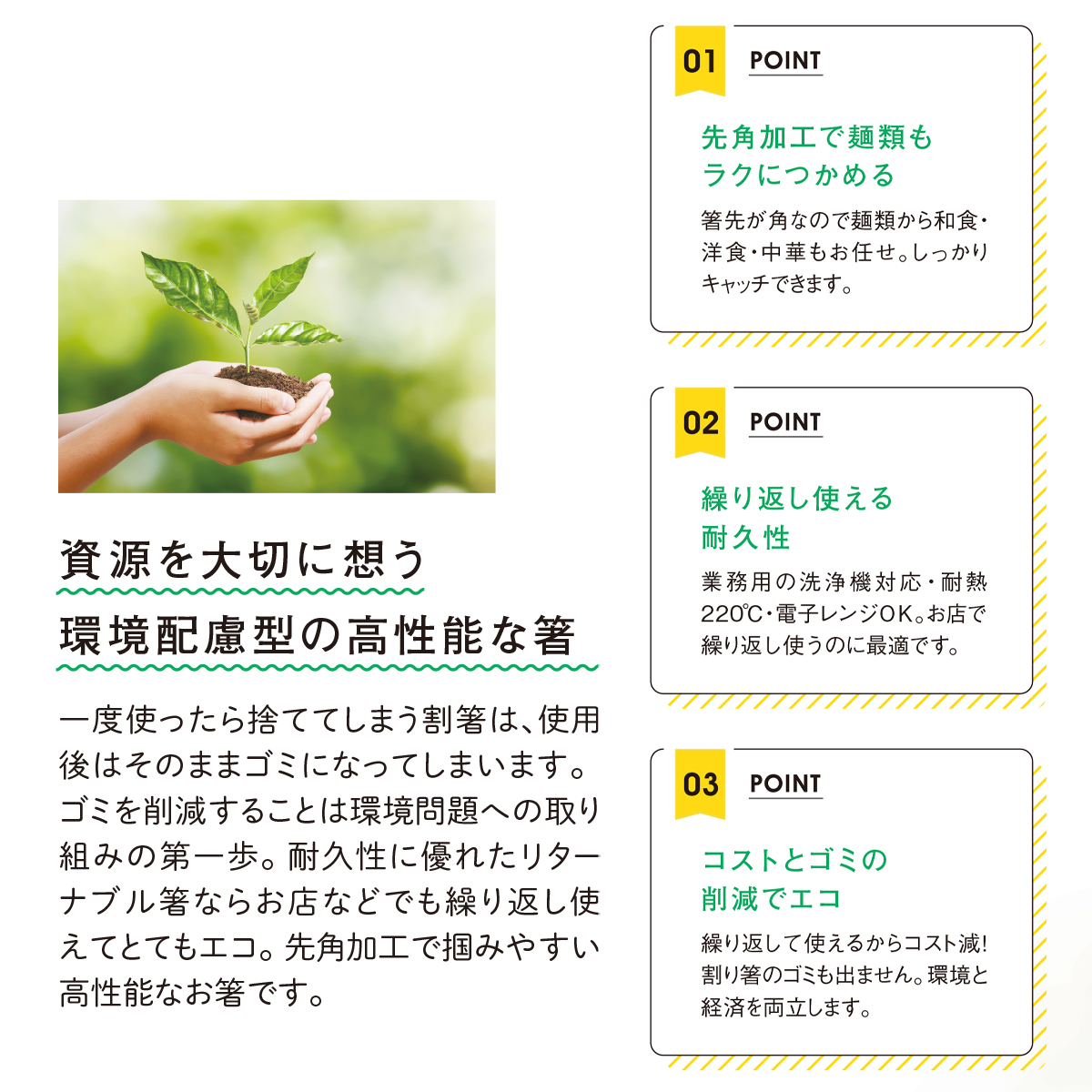 繰り返して使えるからコスト減! 割り箸のゴミも出ません。環境と経済を両立します。