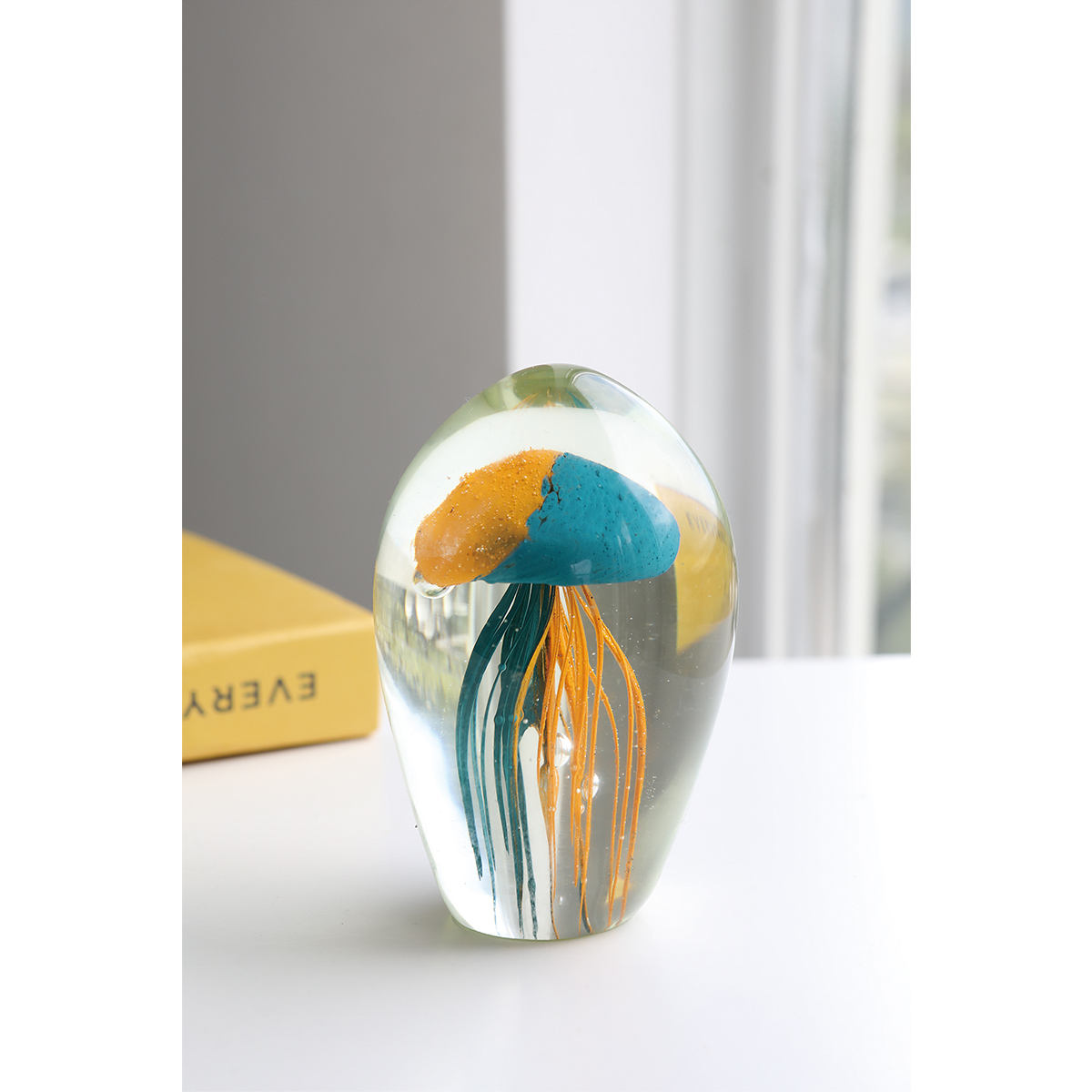 透明なガラスの中に優雅に漂うクラゲのオブジェ。