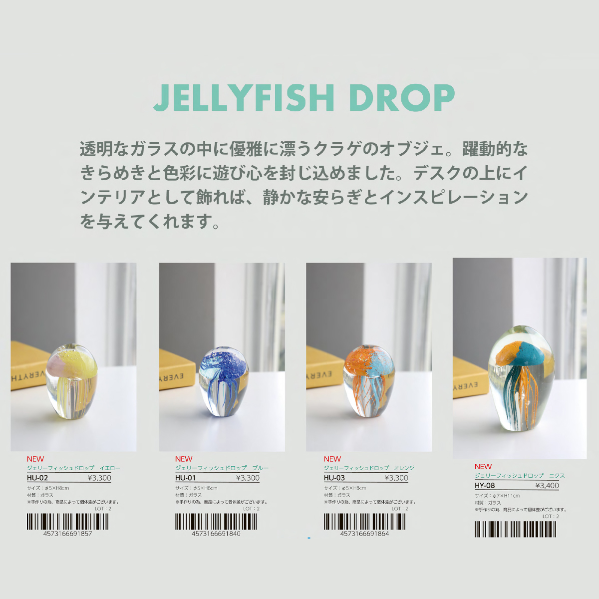 | サイズ | HU-01 ジェリーフィッシュドロップ ブルー : W5×H8 HU-02 ジェリーフィッシュドロップ イエロー : W5×H8 HU-03 ジェリーフィッシュドロップ オレンジ : W5×H8 HY-08 ジェリーフィッシュドロップ ニクス : W7×H11 |