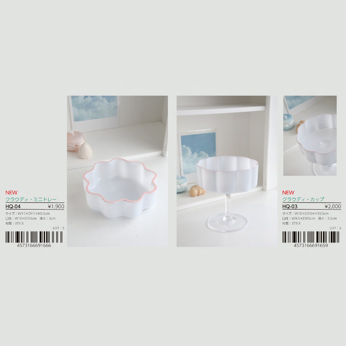 | サイズ | HQ-03 クラウディ・カップ : W10×D10×H10.5 HQ-04 クラウディ・ミニトレー : W11×D11×H3.5 |