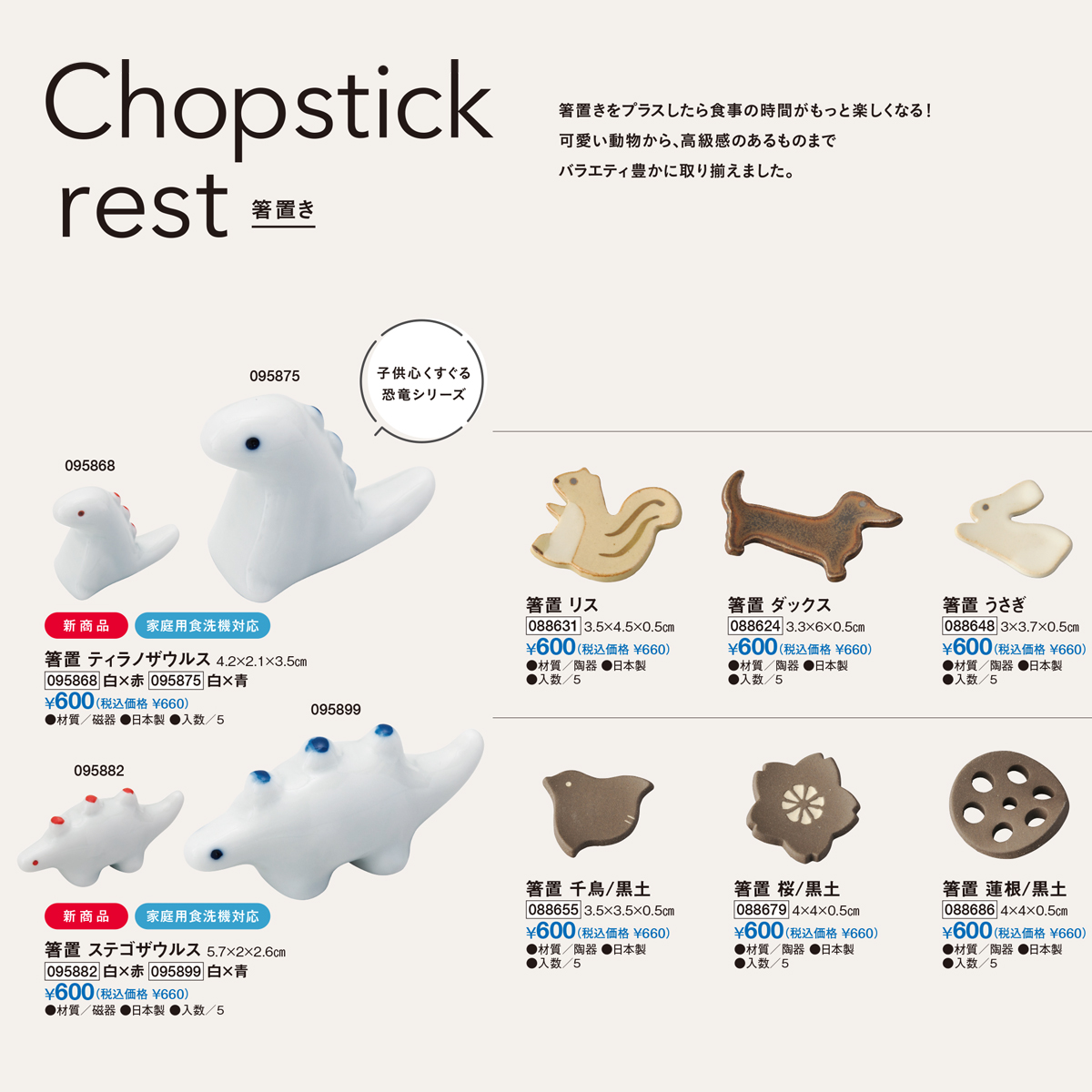 | 素材 | 【ティラノザウルス、ステゴザウルス】 磁器 【うしろネコ、リス、ダックス、うさぎ、千鳥/黒土、桜/黒土、蓮根/黒土】 陶器 |