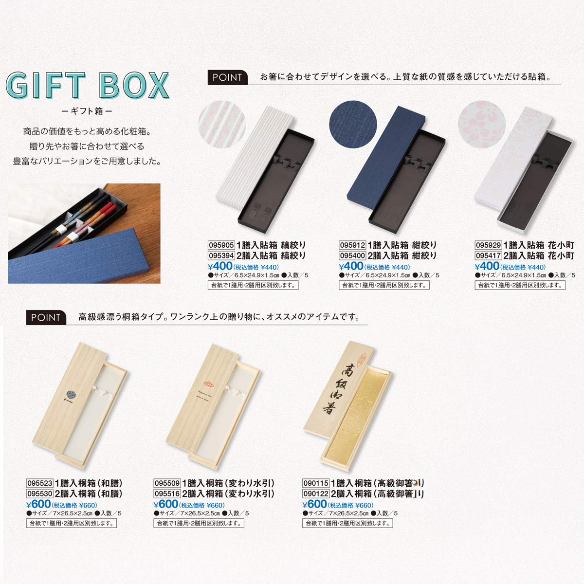 商品の価値をもっと高める化粧箱。贈り先やお箸に合わせて選べる豊富なバリエーションをご用意しました。