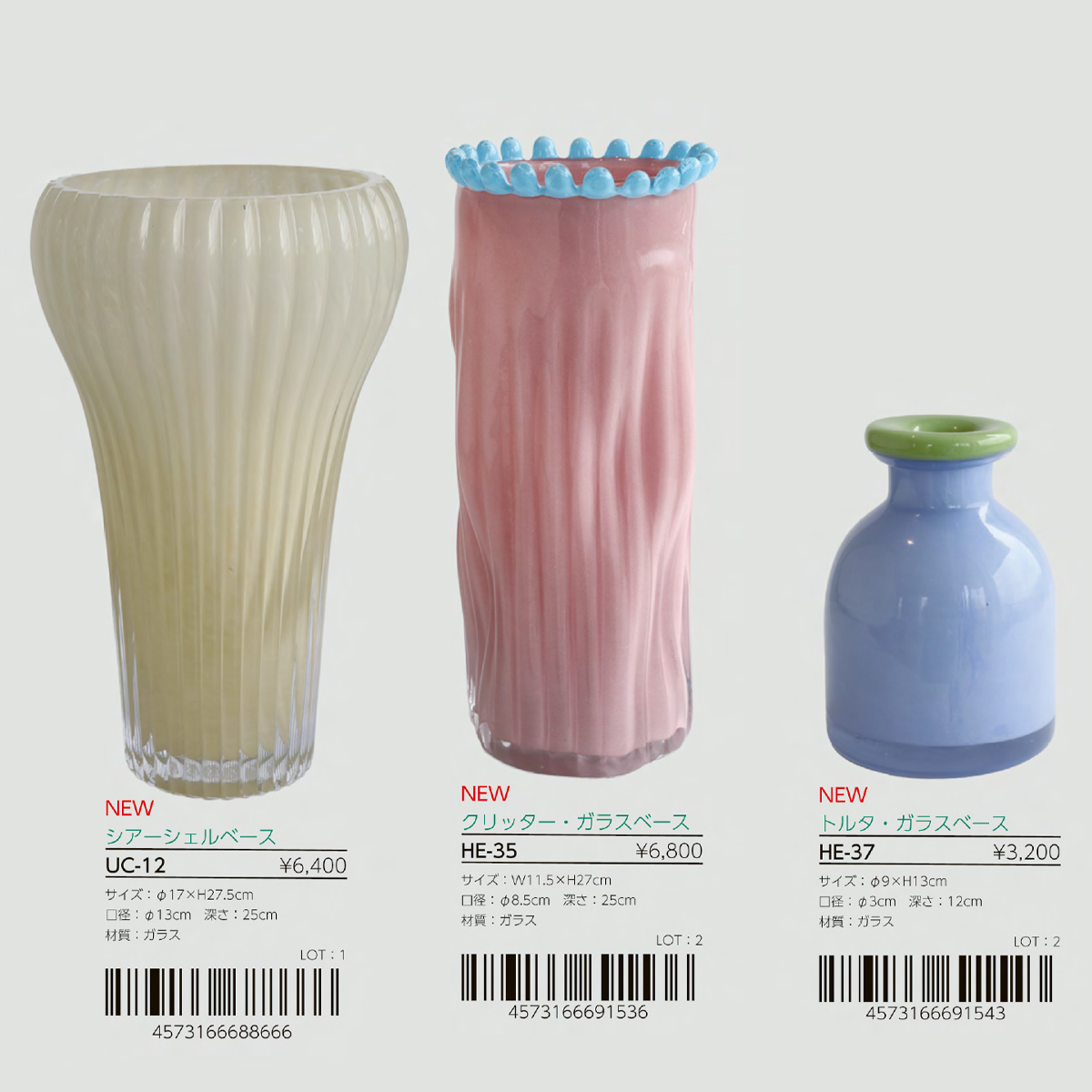 | サイズ | UC-12 シアーシェルベース : W17×H27.5 HE-35 クリッター・ガラスベース : W11.5×H27 HE-37 トルタ・ガラスベース : W9×H13 |