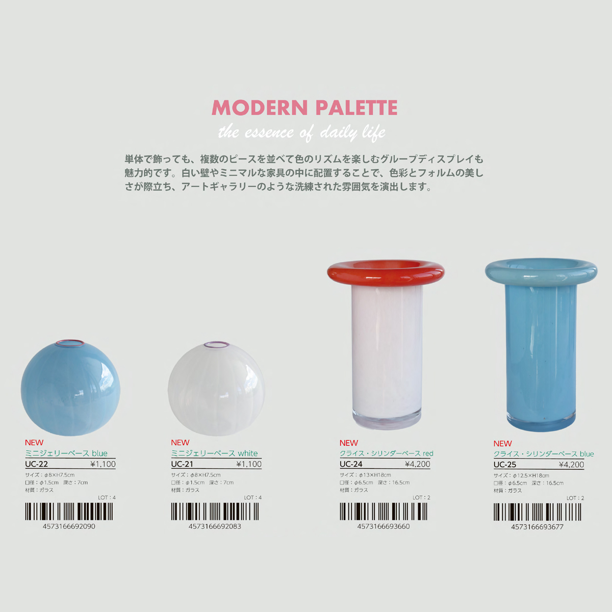 | サイズ | UC-21 ミニジェリーベース white : W8×H7.5 UC-22 ミニジェリーベース blue : W8×H7.5 UC-24 クライス・シリンダーベース red : W13×H18 UC-25 クライス・シリンダーベース blue : W12×H18 |