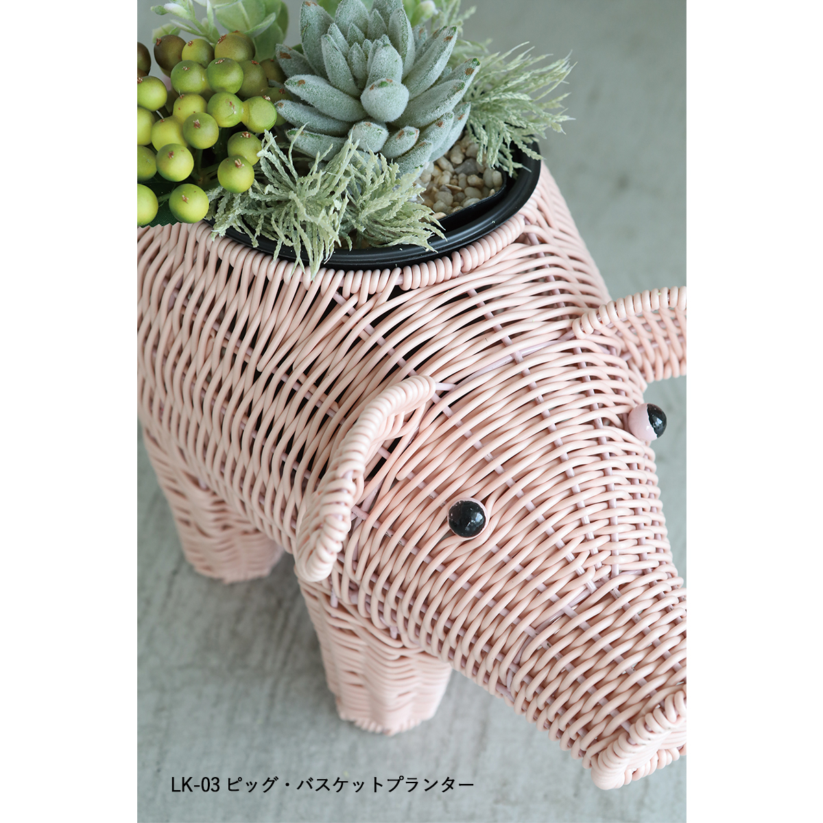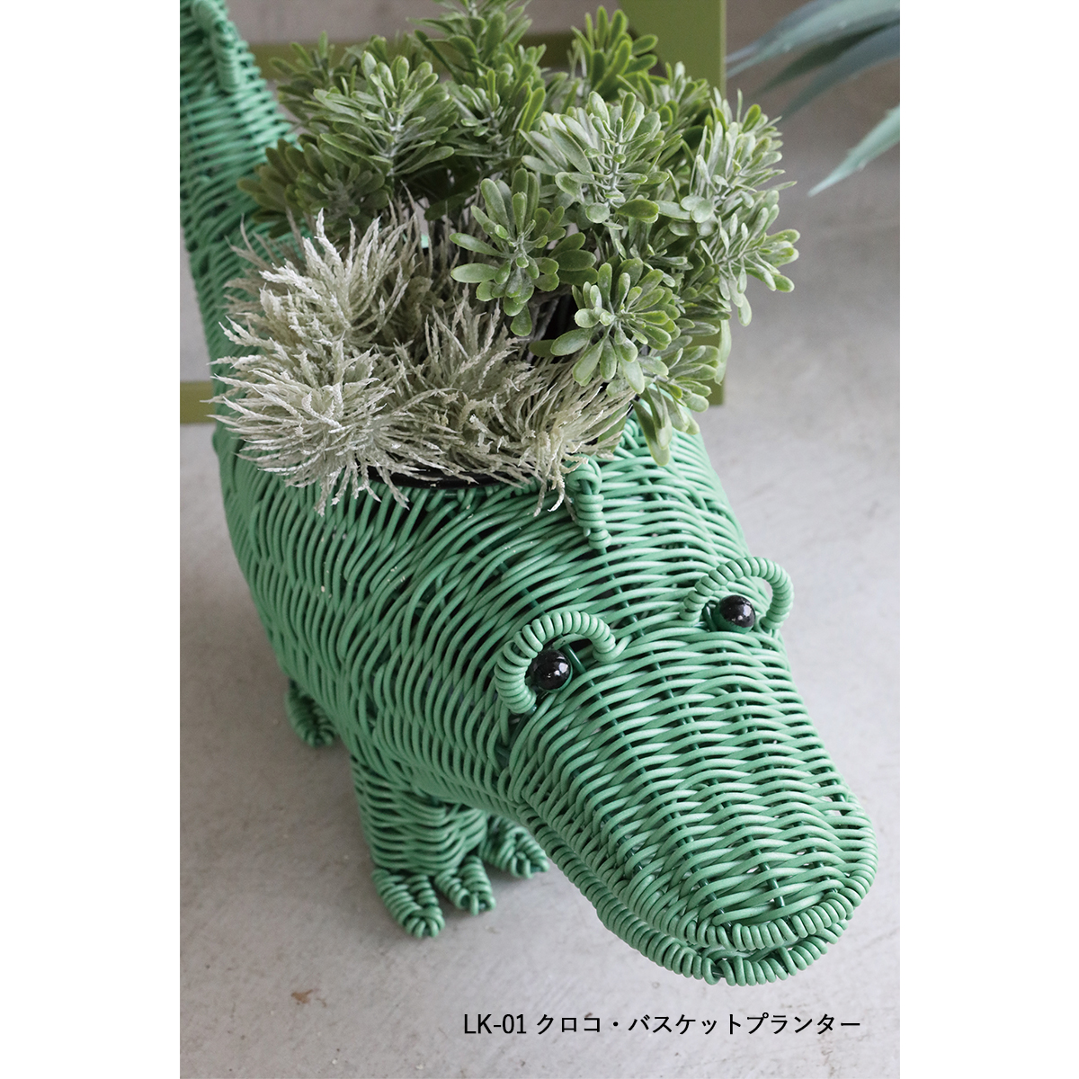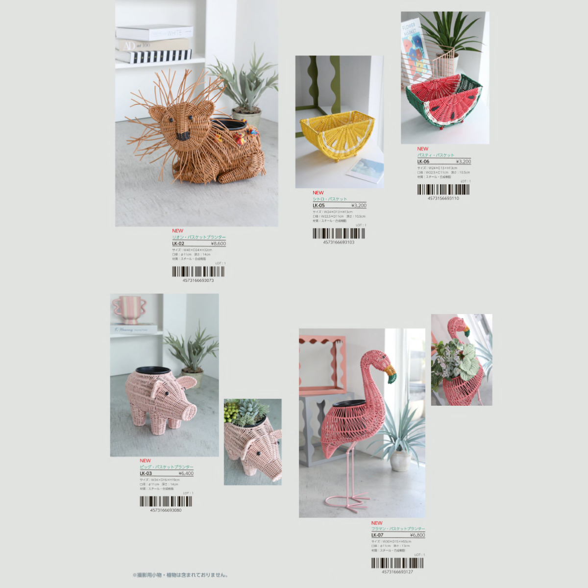 | サイズ | LK-01 クロコ・バスケットプランター : W46×D16×H25 LK-04 バード・バスケット : W40×D21×H21 LK-02 リオン・バスケットプランター : W40×D24×H32 LK-03 ピッグ・バスケットプランター : W34×D16×H19 LK-05 シトロ・バスケット : W24×D13×H13 |