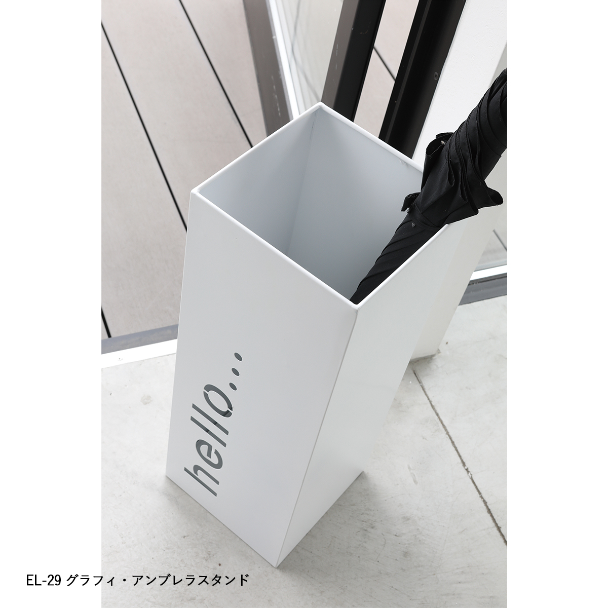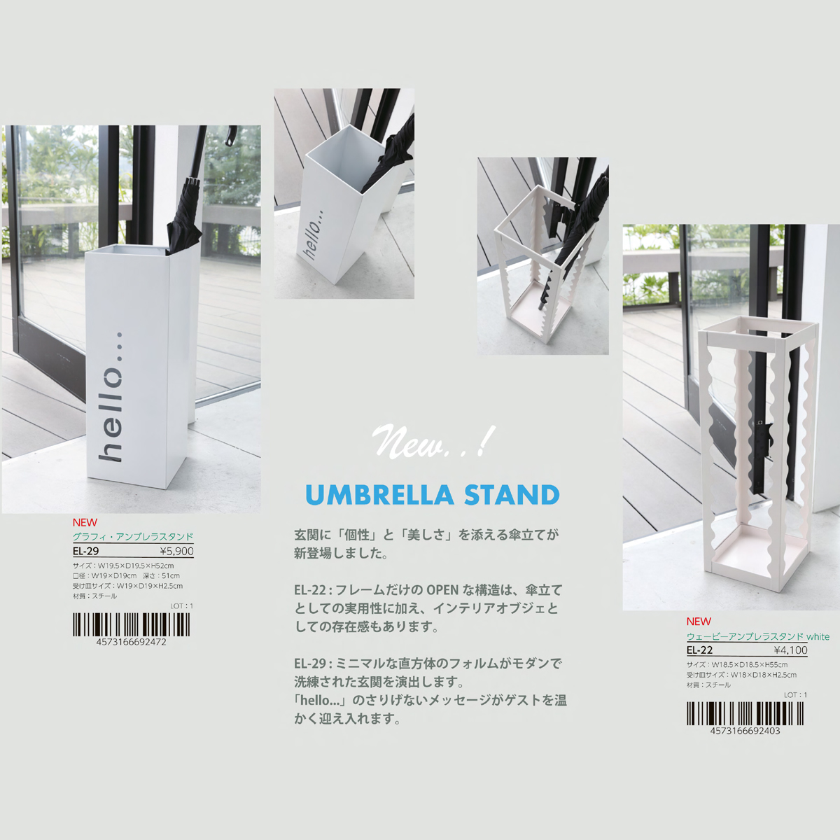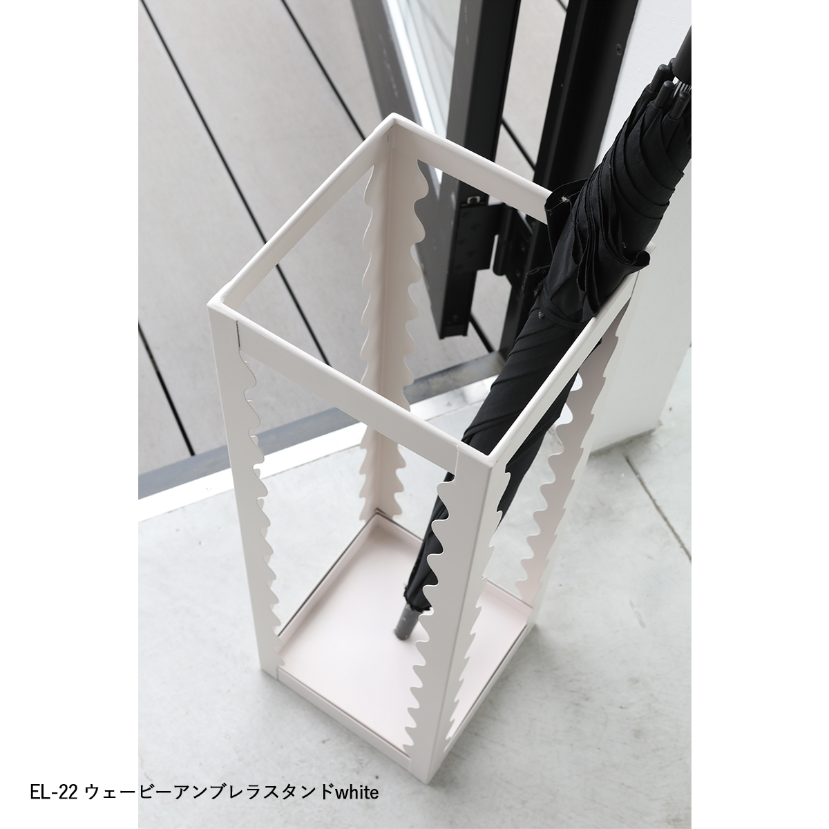 | サイズ | EL-25 イーリア・ストレージボックス flat : W47×D30.5×H23.5 EL-22 ウェービーアンブレラスタンドwhite : W18.5×D18.5×H55 EL-24 イーリア・ストレージボックス large : W47×D30×H31 EL-26 イーリア・ストレージボックス midi : W30×D30×H36.5 EL-29 グラフィ・アンブレラスタンド : W19.5×D19.5×H52 |