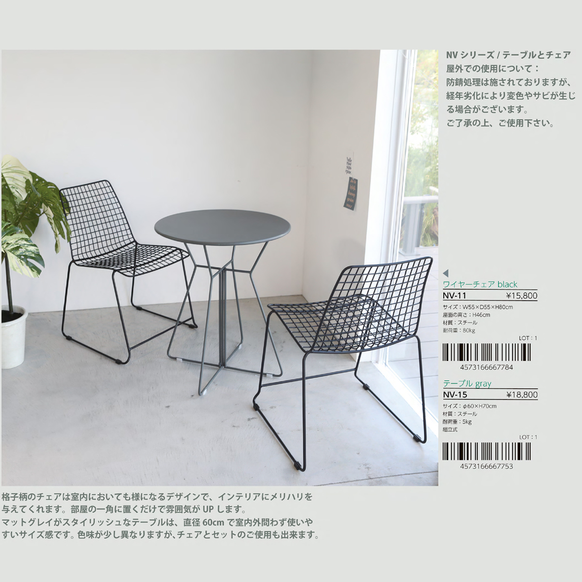 | サイズ | NV-11 ワイヤーチェア black : W55×D55×H80 NV-15 テーブル gray : W60×H70 |