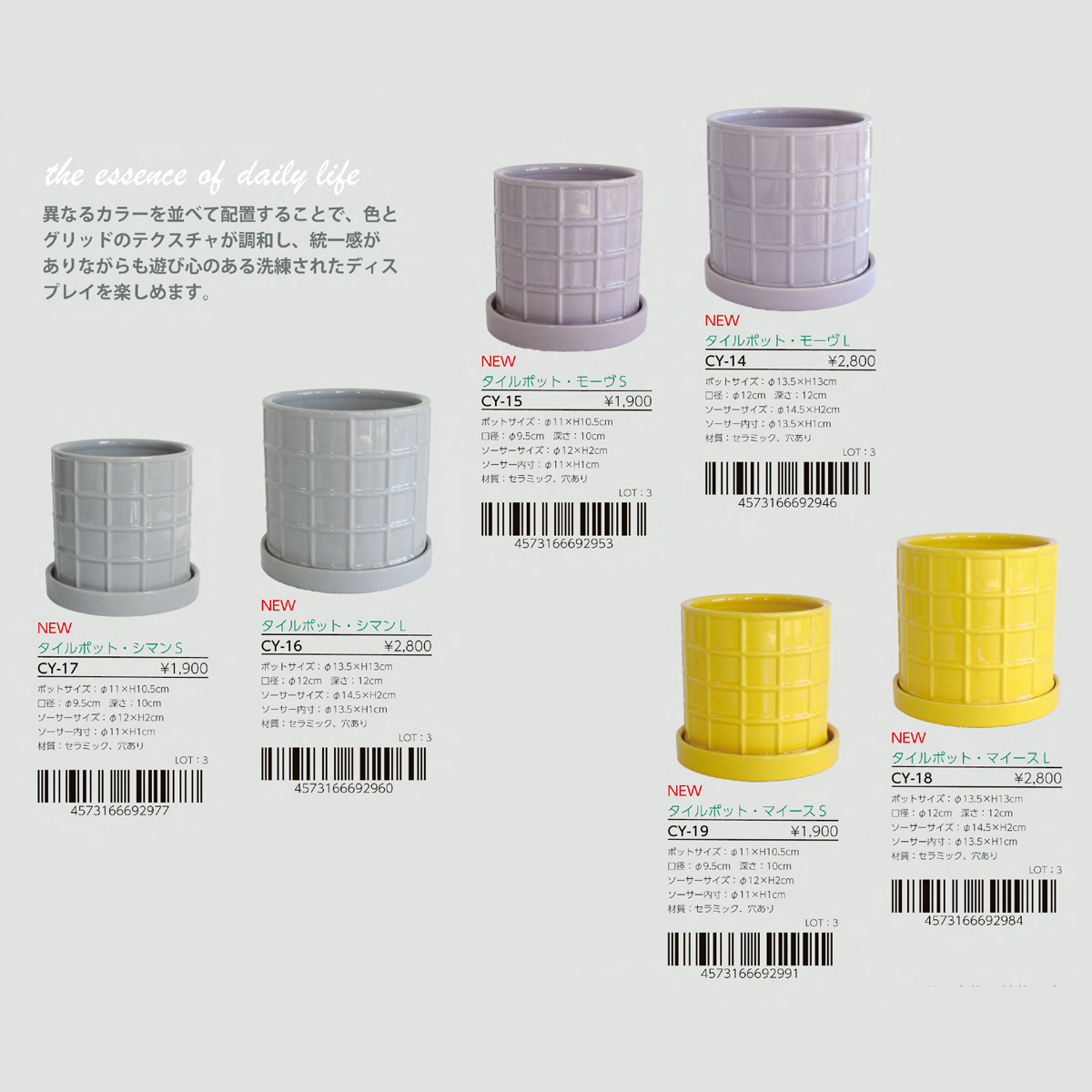 | サイズ | CY-14 タイルポット・モーヴL : W13.5×H13 CY-15 タイルポット・モーヴS : W11×H10.5 CY-16 タイルポット・シマンL : W13.5×H13 CY-17 タイルポット・シマンS : W11×H10.5 CY-18 タイルポット・マイースL : W13.5×H13 CY-19 タイルポット・マイースS : W11×H10.5 |