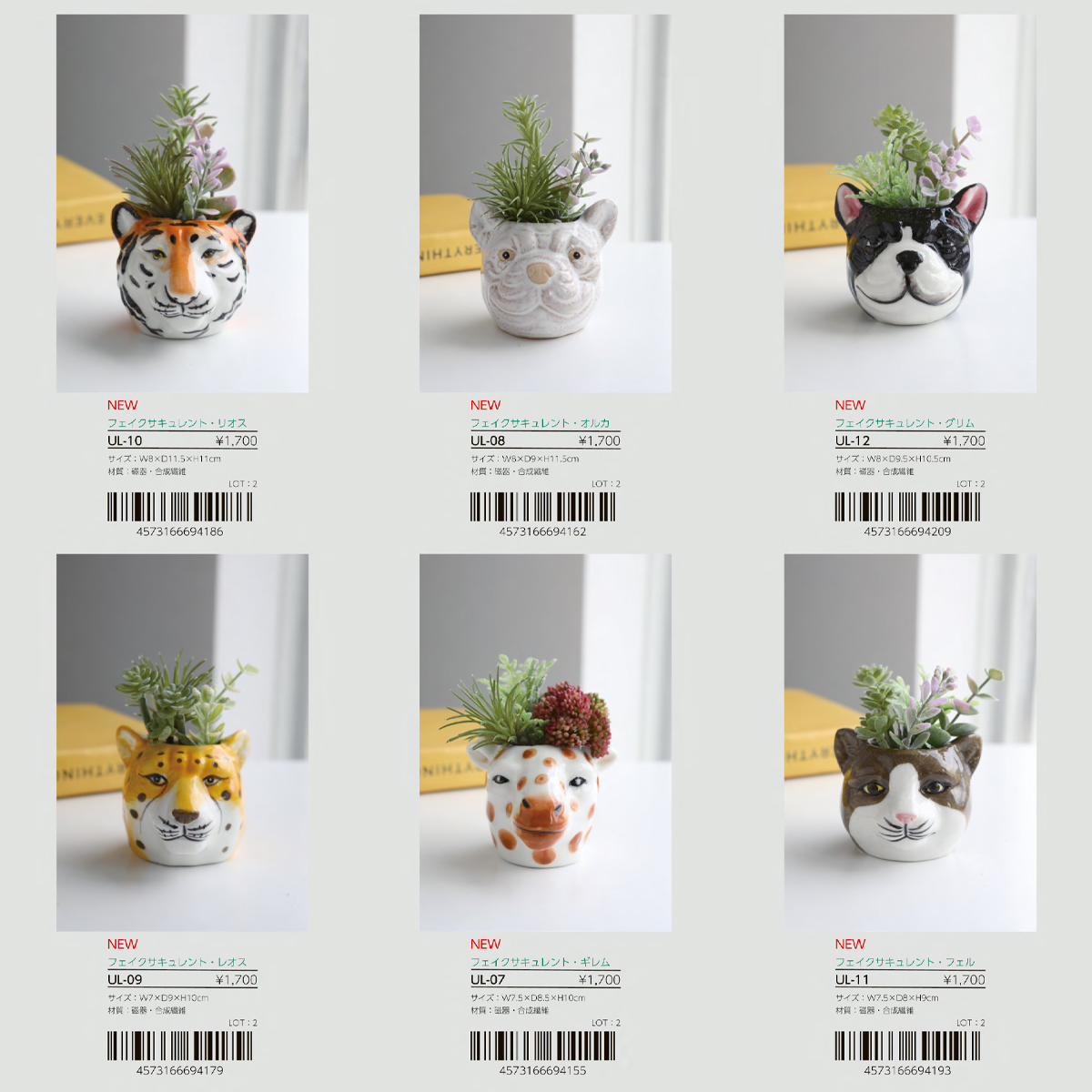 | サイズ | UL-07 フェイクサキュレント・ギレム : W7.5×D8.5×H10 UL-08 フェイクサキュレント・オルカ : W8×D9×H11.5 UL-09 フェイクサキュレント・レオス : W6×D9×H10 UL-10 フェイクサキュレント・リオス : W8×D11.5×H11 UL-11 フェイクサキュレント・フェル : W7.5×D8×H9 UL-12 フェイクサキュレント・グリム : W7.5×D9.5×H10.5 |