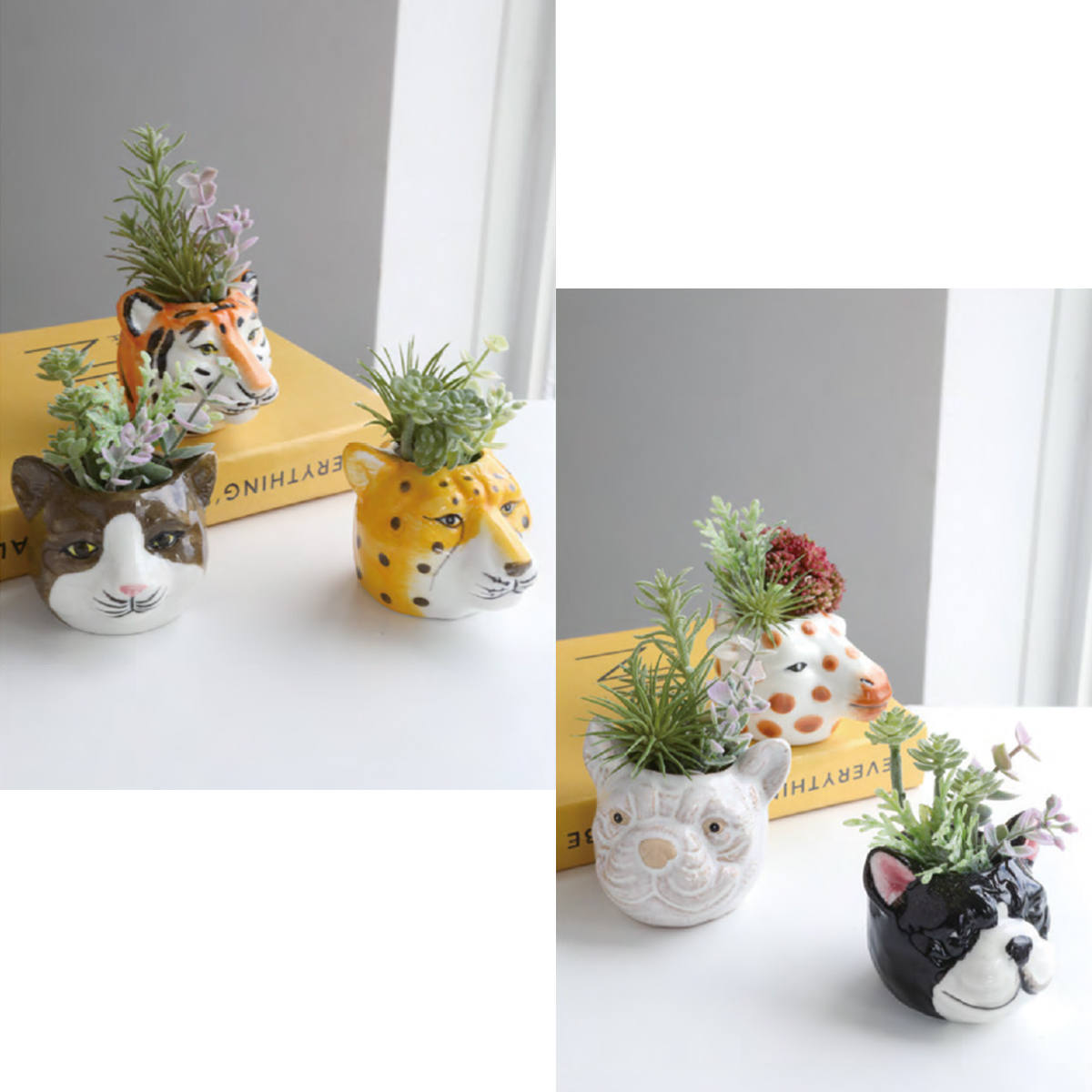 思わず「可愛い!」と声が漏れる、個性豊かなアニマルたちに、多肉アレンジポットが登場しました。デフォルメされた愛らしい表情が魅力で、陶器のぬくもりある質感と、手描きのような細やかな表現が心をくすぐります。どこでも飾れるサイズ感も魅力。