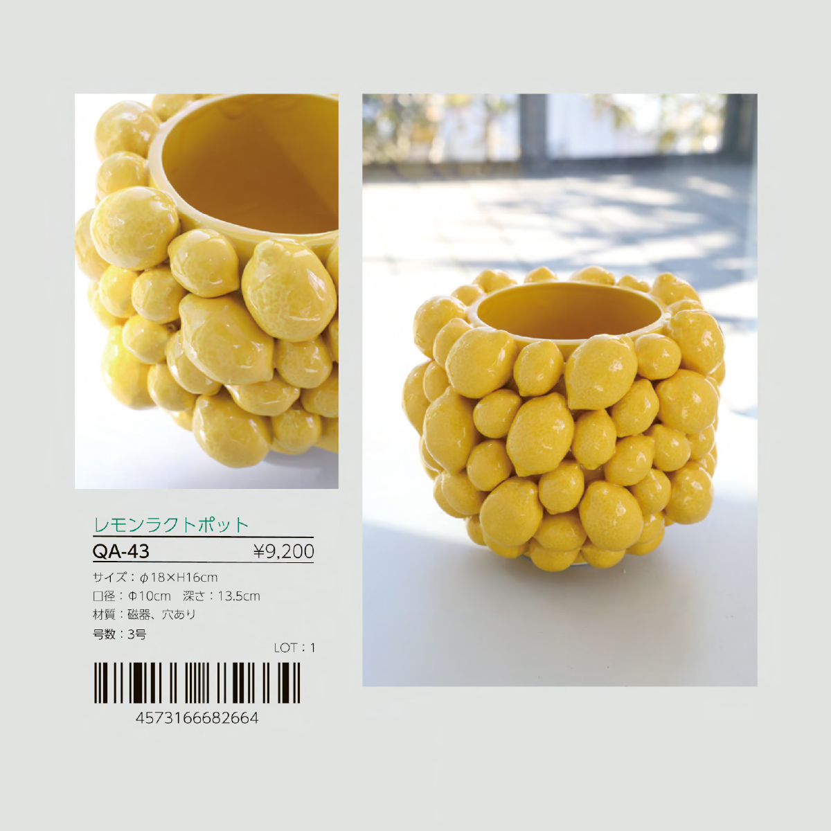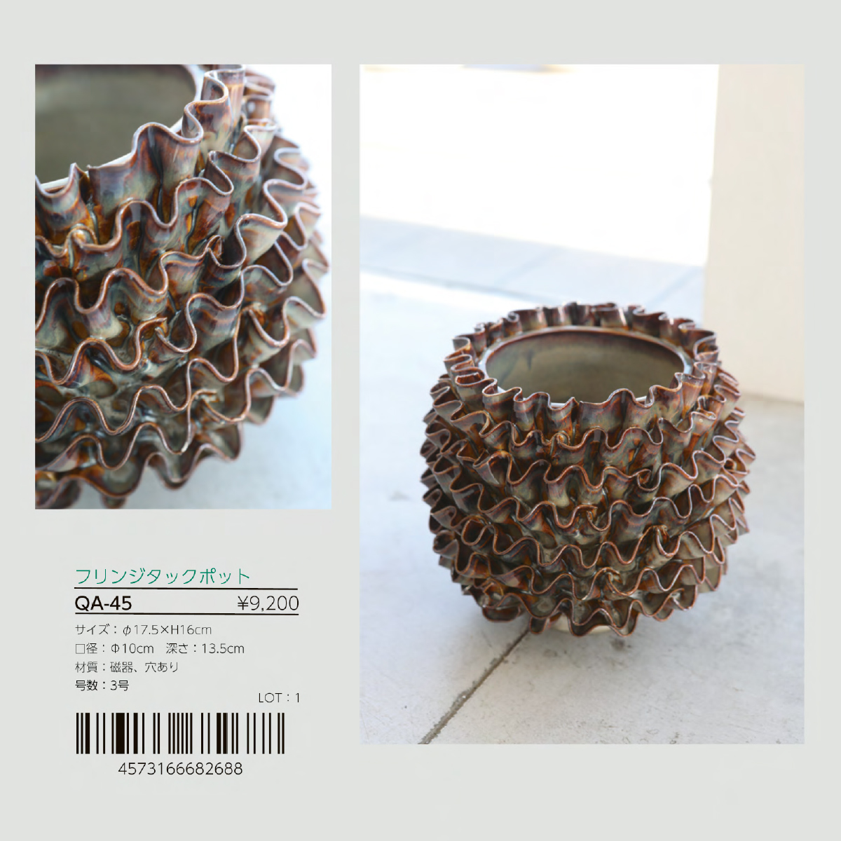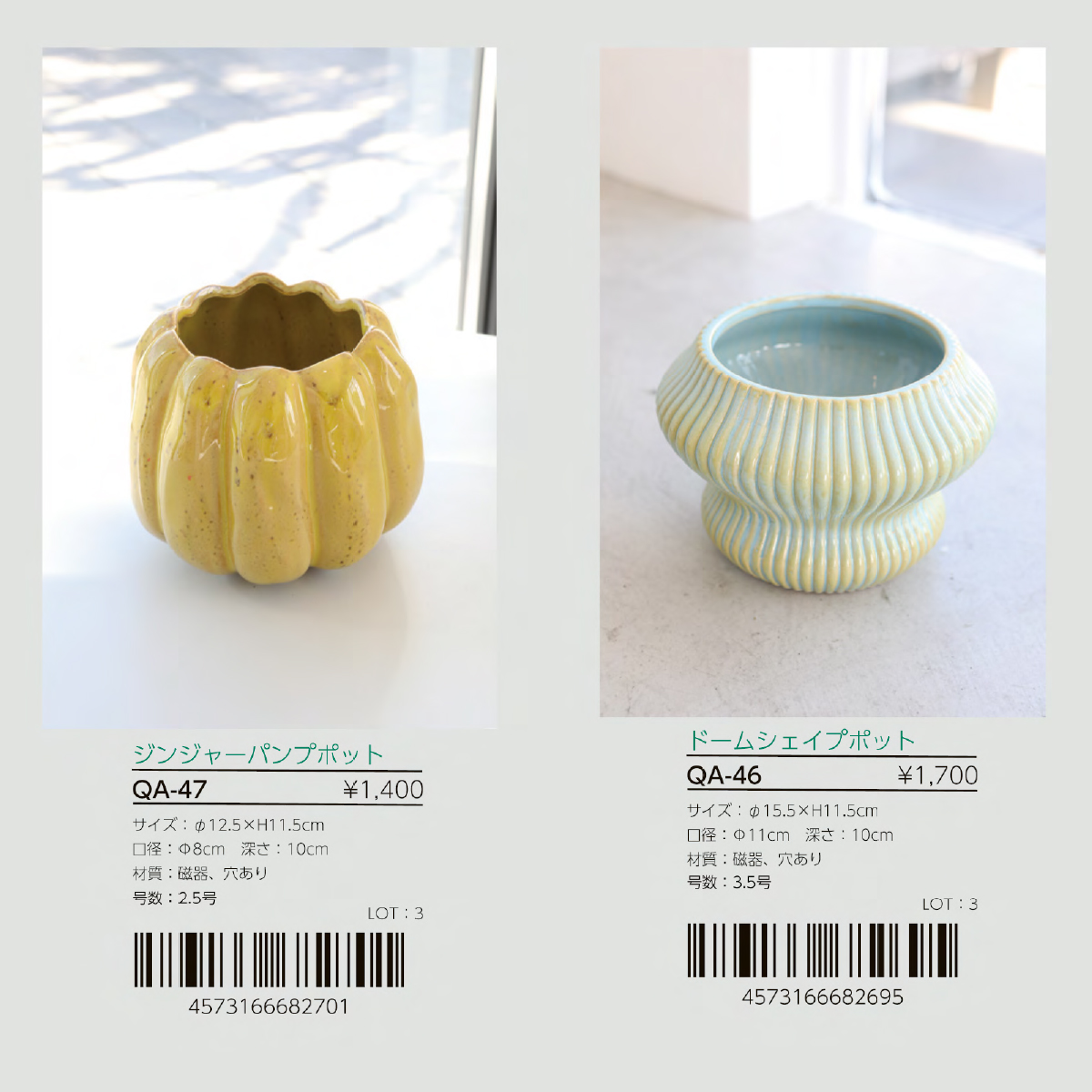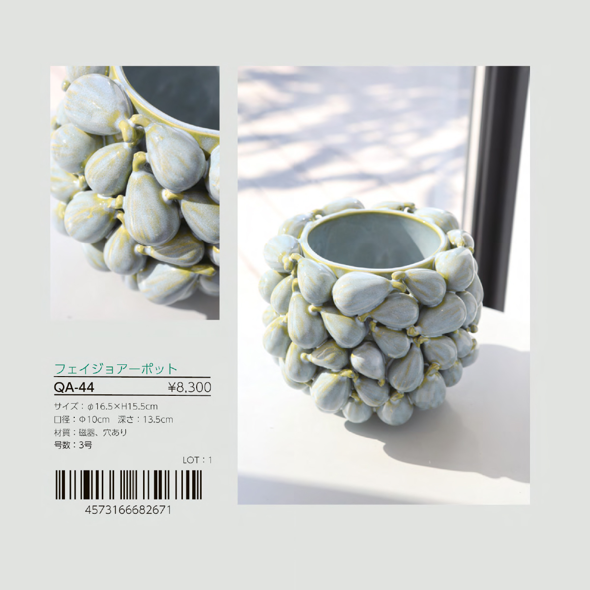 | サイズ | QA-43 レモンラクトポット : W18×H16 QA-44 フェイジョアーポット : W16.5×H15.5 QA-45 フリンジタックポット : W17.5×H16 QA-46 ドームシェイプポット : W15.5×H11.5 QA-47 ジンジャーパンプポット : W12.5×H11.5 |