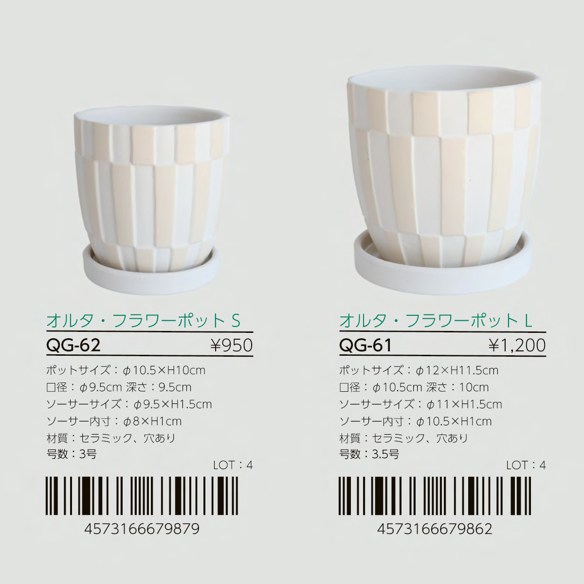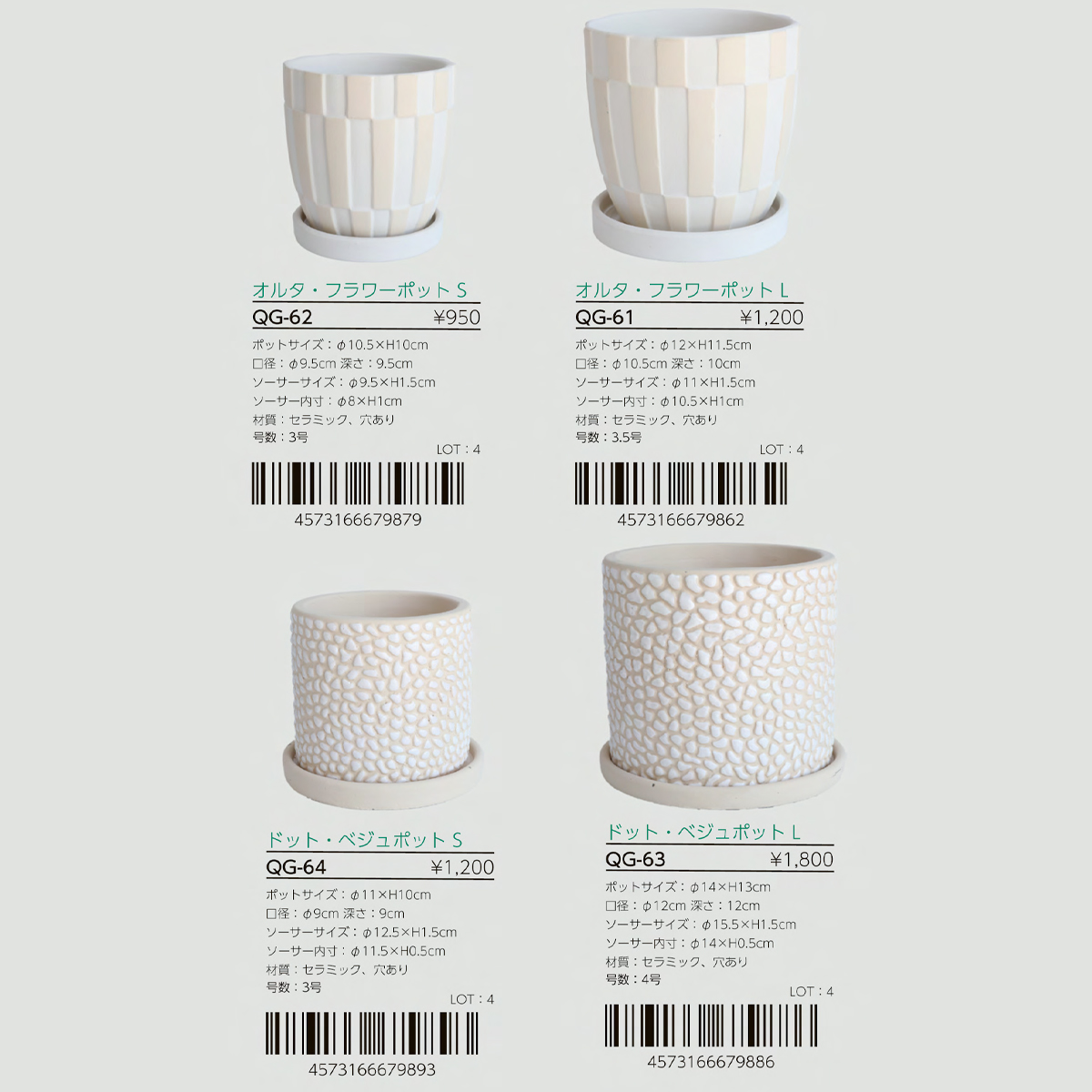 | サイズ | QG-61 オルタ・フラワーポットL : W12×H11.5 QG-62 オルタ・フラワーポットS : W10.5×H10 QG-63 ドット・ベジュポット L : W14×H13 QG-64 ドット・ベジュポットS : W11×H10 |