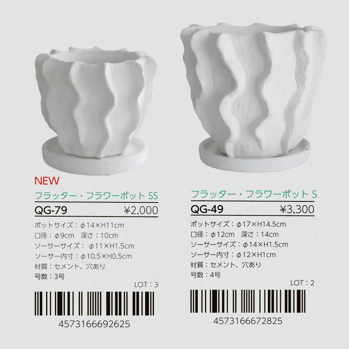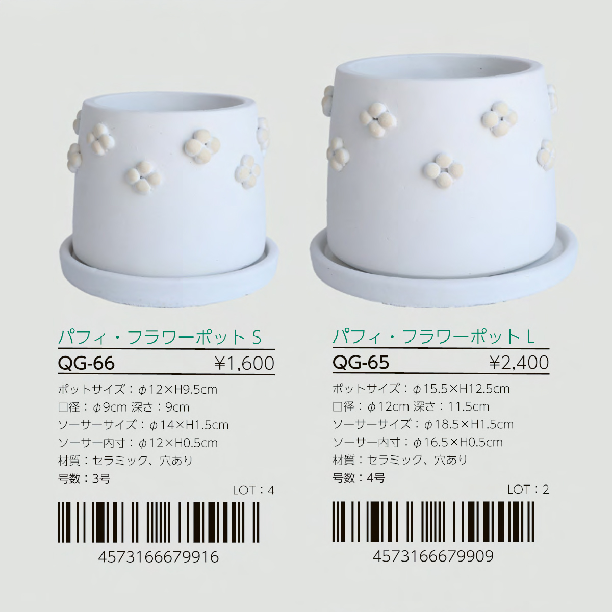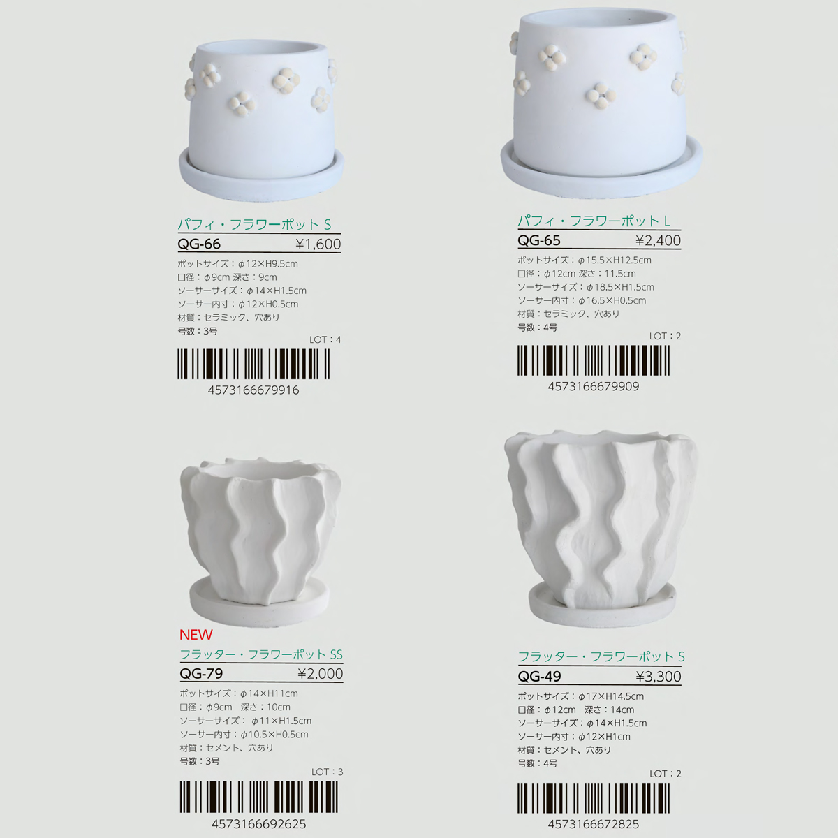 | 素材 | QG-49 フラッター・フラワーポットS : 穴あり QG-65 パフィ・フラワーポットL : セラミック、穴あり QG-66 パフィ・フラワーポットS : セラミック、穴あり QG-79 フラッター・フラワーポットSS : セメント |