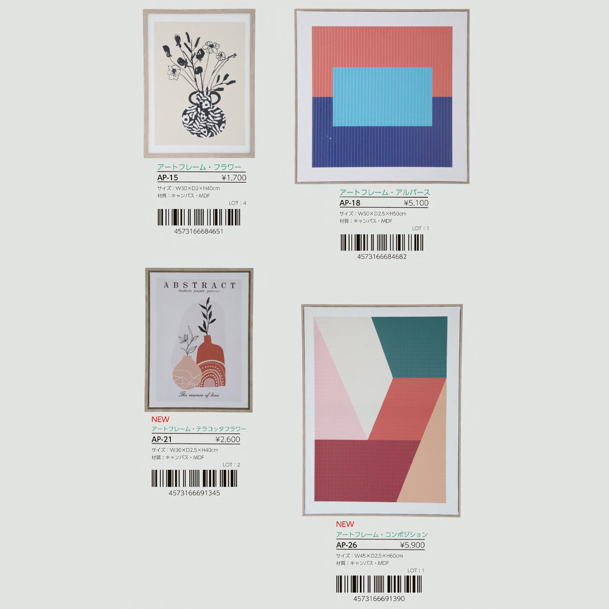 | サイズ | AP-21 アートフレーム・テラコッタフラワー : W30×D2.5×H40 AP-26 アートフレーム・コンポジション : W45×D2.5×H60 AP-15 アートフレーム・フラワー : W30×D2×H40 AP-18 アートフレーム・アルバース : W50×D2.5×H50 |