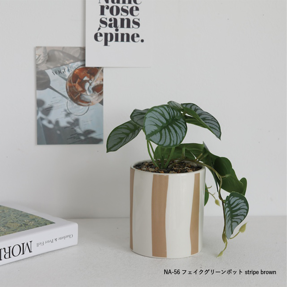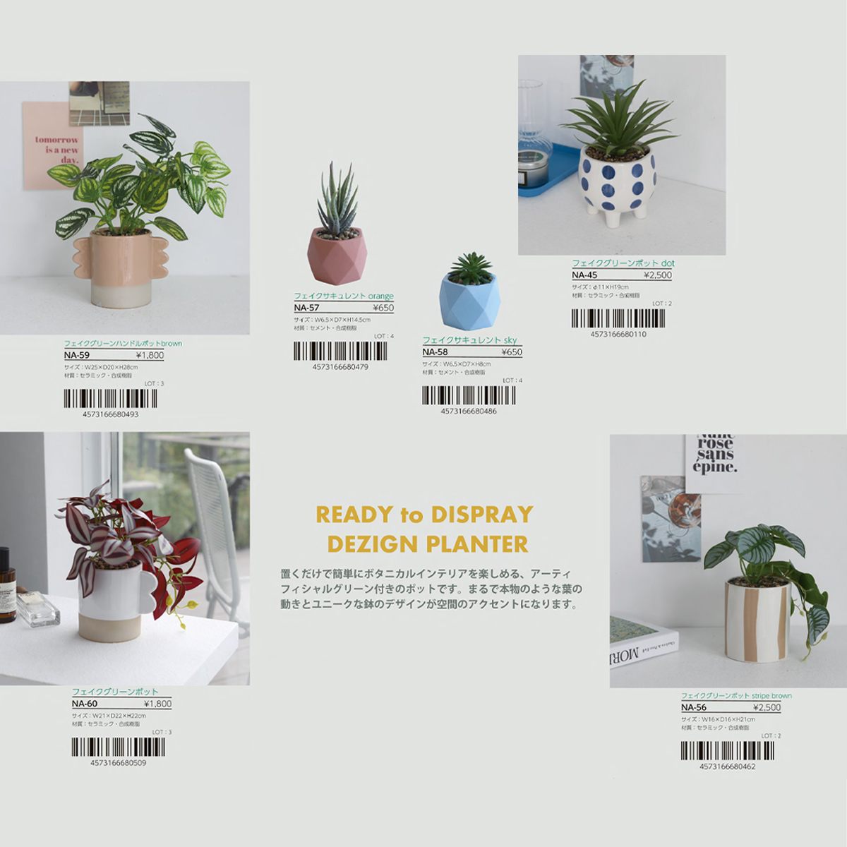 | サイズ | NA-45 フェイクグリーンポット dot : W11×H19 NA-56 フェイクグリーンポット stripe brown : W16×D16×H21 NA-57 フェイクサキュレント orange : W6.5×D7×H14.5 NA-58 フェイクサキュレント sky : W6.5×D7×H8 NA-59 フェイクグリーンハンドルポットbrown : W25×D20×H28 NA-60 フェイクグリーンポット : W21×D22×H22 |