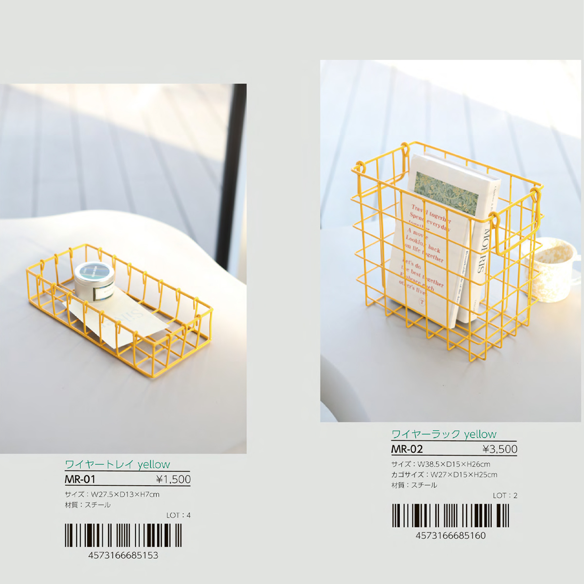 | サイズ | MR-01 ワイヤートレイ yellow : W27.5×D13×H7 MR-02 ワイヤーラック yellow : W38.5×D15×H26 |
