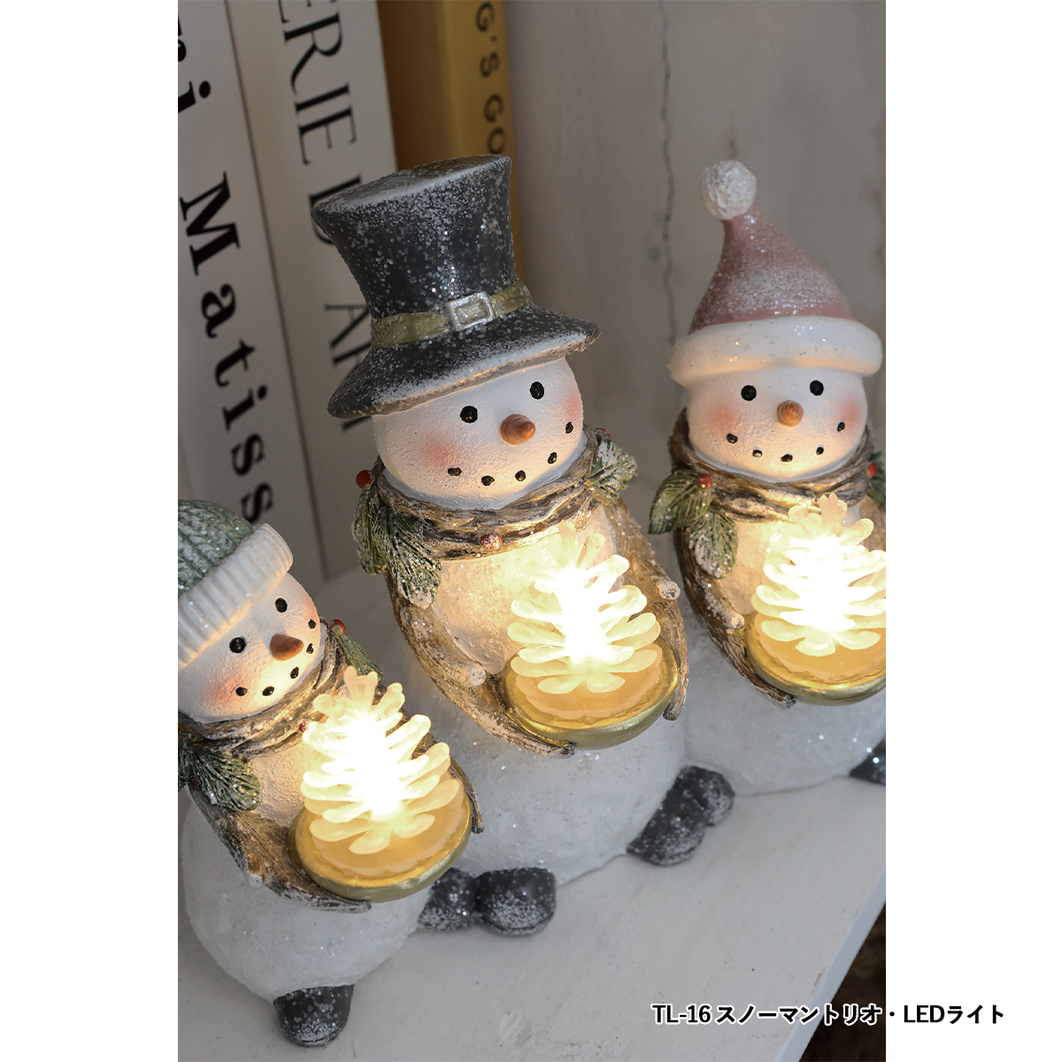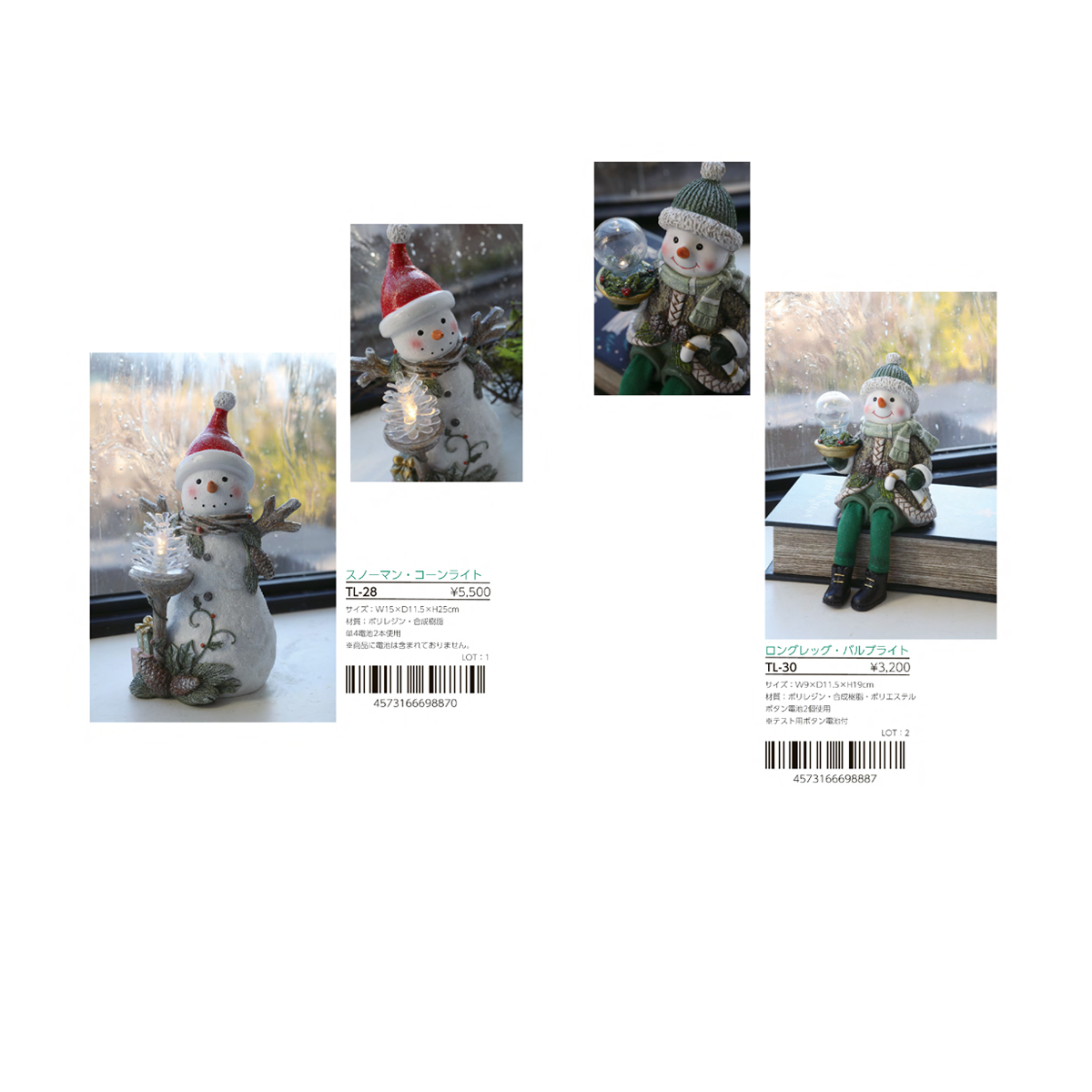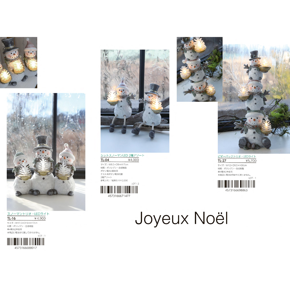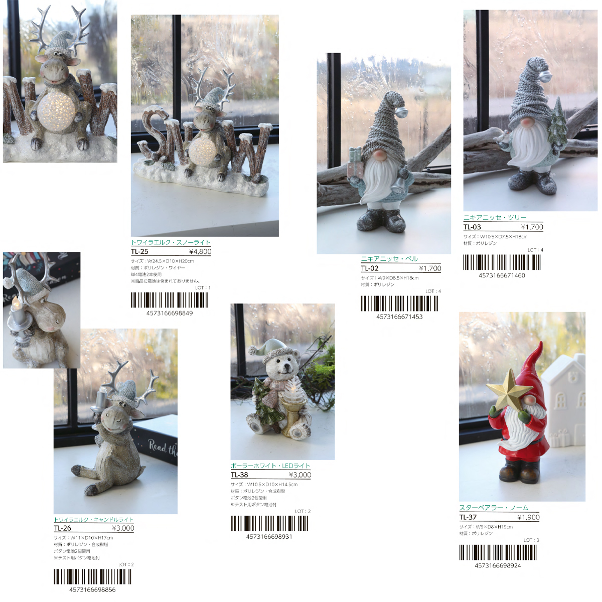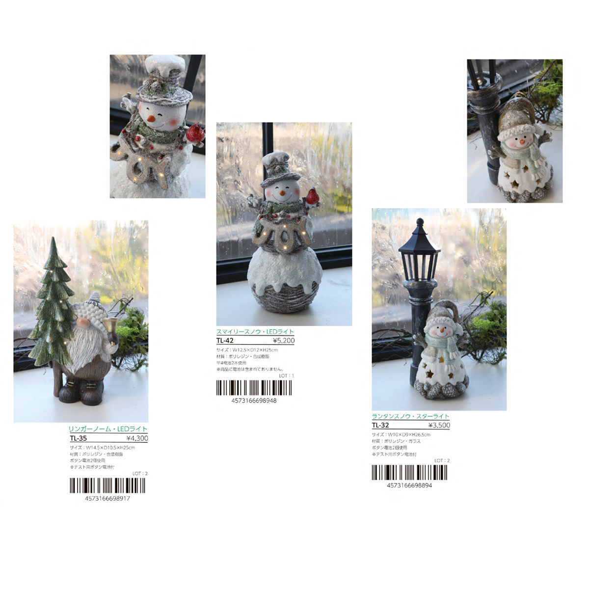 | 素材 | TL-04 シットスノーマン・LEDライト 2種アソート : ポリレジン・合成樹脂 TL-16 スノーマントリオ・LEDライト : ポリレジン・合成樹脂 TL-27 ピギーバックトリオ・LEDライト : ポリレジン・合成樹脂 TL-32 ランタンスノーマン・スターライト : ポリレジン・ガラス TL-35 リンガーノーム・LEDライト : ポリレジン・合成樹脂 TL-42 スマイリースノウ・LEDライト : ポリレジン・合成樹脂 TL-02 ニキアニッセ・ベル : ポリレジン TL-03 ニキアニッセ・ツリー : ポリレジン TL-25 トワイラエルク・スノーライト : ポリレジン・ワイヤー TL-26 トワイラエルク・キャンドルライト : ポリレジン・合成樹脂 TL-28 スノーマン・コーンライト : ポリレジン・合成樹脂 TL-30 ロングレッグ・バルブライト : ポリレジン・合成樹脂・ポリエステル TL-37 スターベアラー・ノーム : ポリレジン TL-38 ポーラーホワイト・LEDライト : ポリレジン・合成樹脂 |