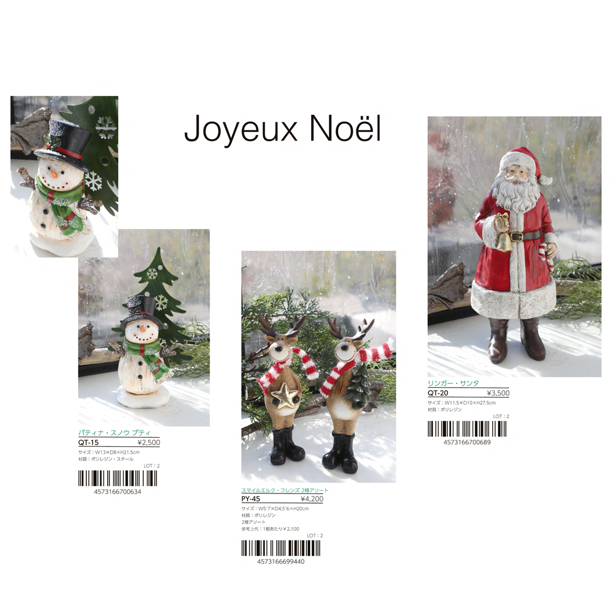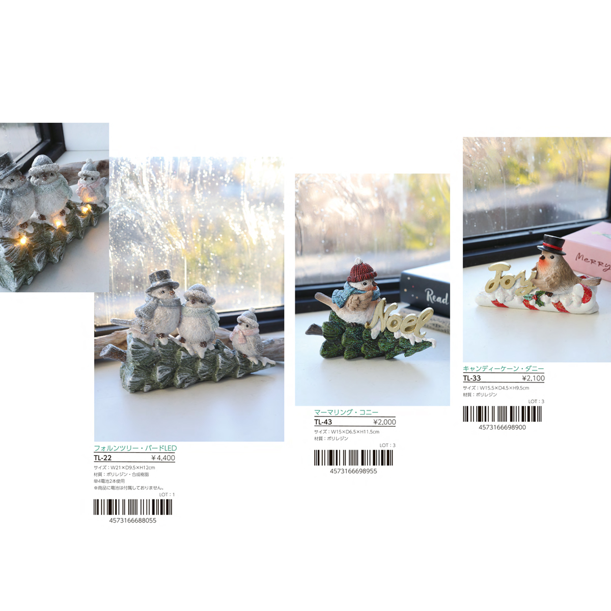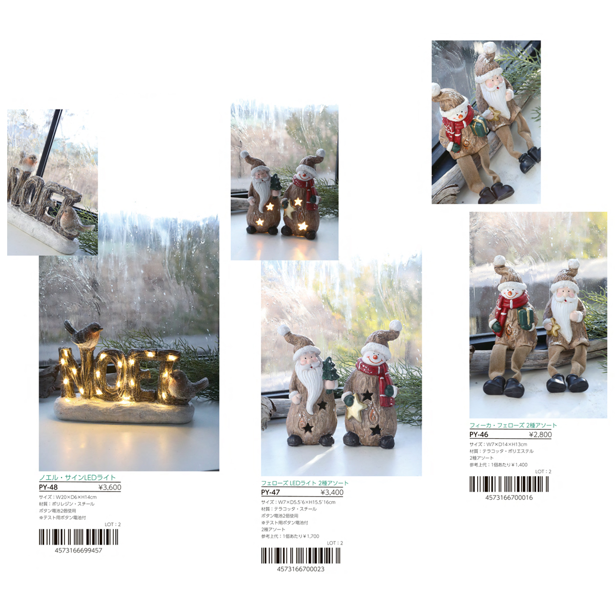 | 素材 | PY-46 フィーカ・フェローズ 2種アソート : テラコッタ PY-47 フェローズ LEDライト 2種アソート : テラコッタ・スチール PY-48 ノエル・サインLEDライト : ポリレジン・スチール TL-22 フォルンツリー・バードLED : ポリレジン・合成樹脂 TL-33 キャンディーケーン・ダニー : ポリレジン TL-43 マーマリング・コニー : ポリレジン PY-45 スマイルエルク・フレンズ 2種アソート : ポリレジン QT-15 パティナ・スノウ プティ : ポリレジン・スチール QT-16 パティナ・スノウ グラン : ポリレジン QT-19 エフォール・ノエルフレンズ : ポリレジン QT-20 リンガー・サンタ : ポリレジン |