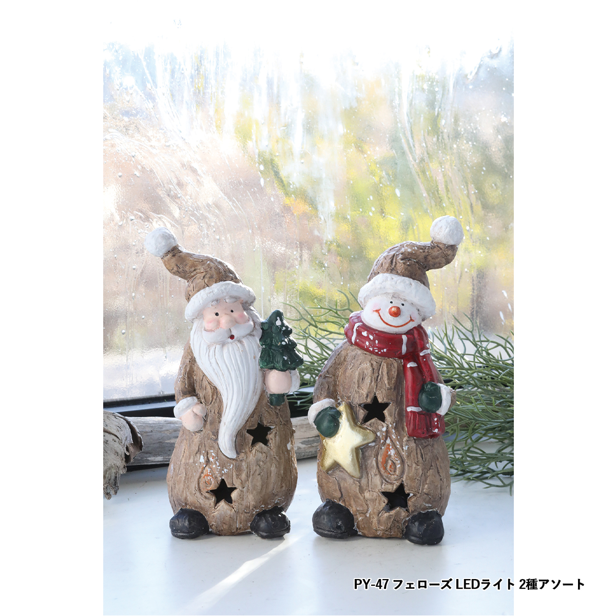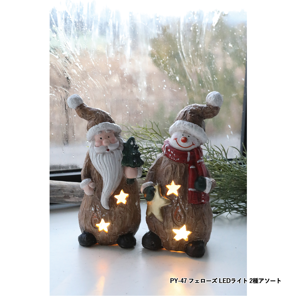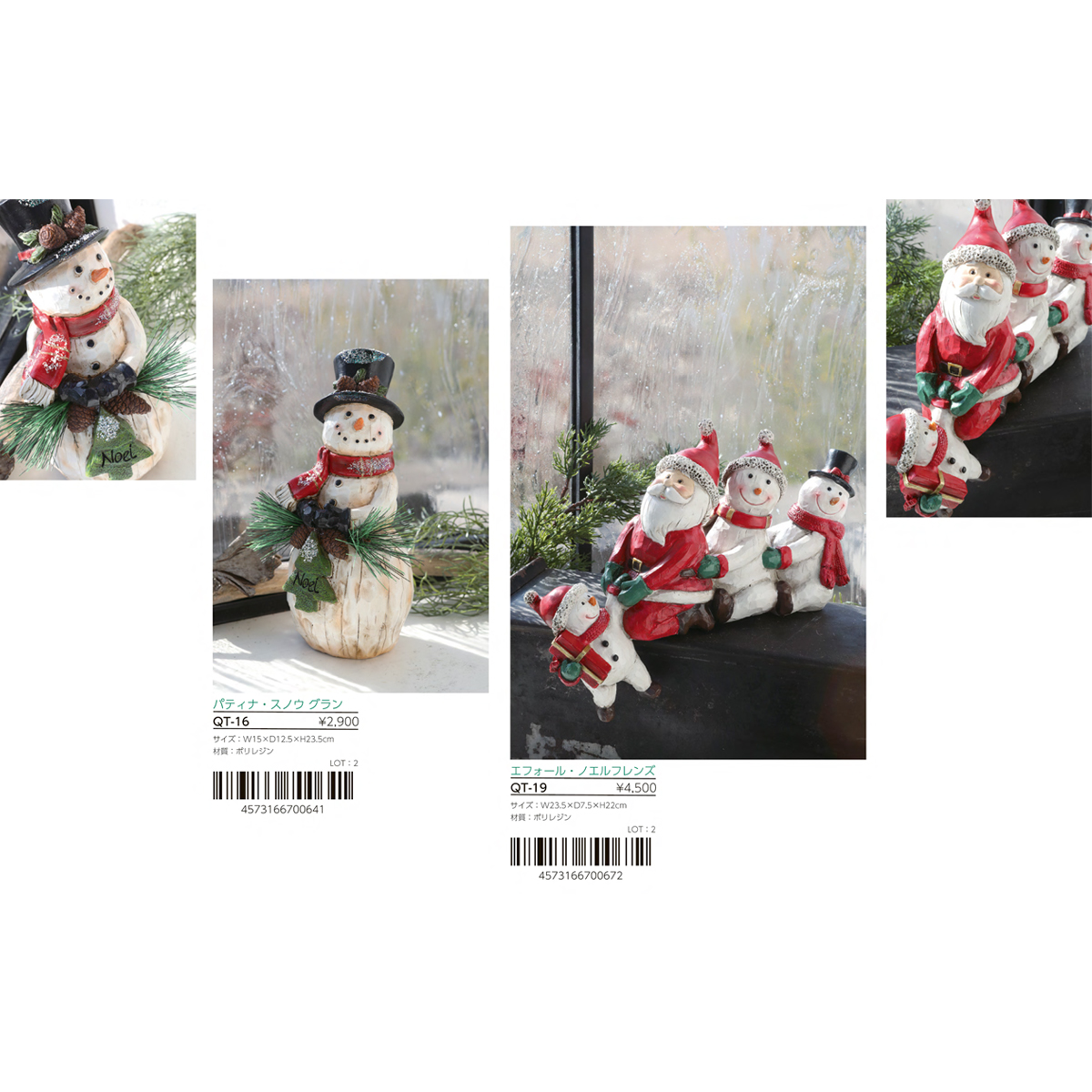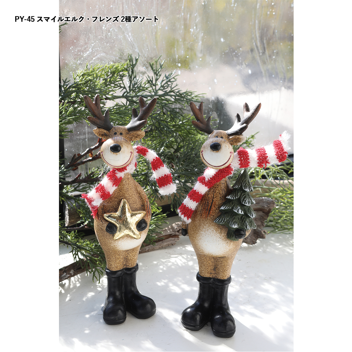 | 素材 | PY-46 フィーカ・フェローズ 2種アソート : テラコッタ PY-47 フェローズ LEDライト 2種アソート : テラコッタ・スチール PY-48 ノエル・サインLEDライト : ポリレジン・スチール TL-22 フォルンツリー・バードLED : ポリレジン・合成樹脂 TL-33 キャンディーケーン・ダニー : ポリレジン TL-43 マーマリング・コニー : ポリレジン PY-45 スマイルエルク・フレンズ 2種アソート : ポリレジン QT-15 パティナ・スノウ プティ : ポリレジン・スチール QT-16 パティナ・スノウ グラン : ポリレジン QT-19 エフォール・ノエルフレンズ : ポリレジン QT-20 リンガー・サンタ : ポリレジン |