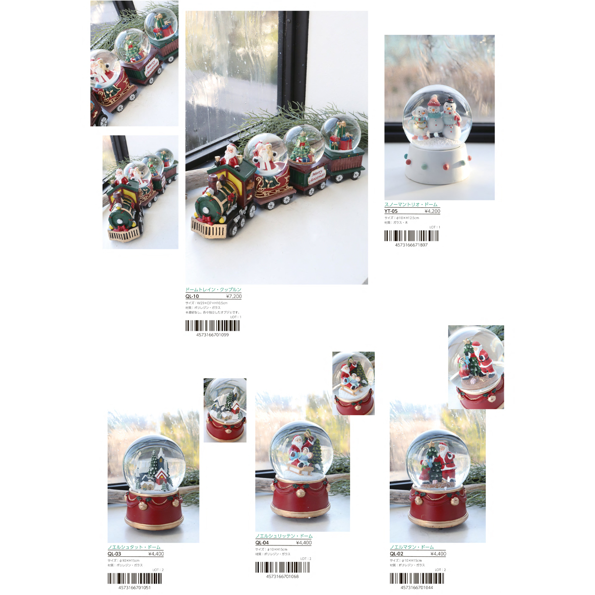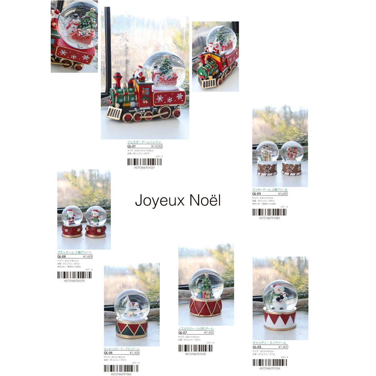 | 素材 | QL-01 フェスタ・ドームトレイン : ポリレジン・ガラス QL-05 キャンディ・スノウドーム : ポリレジン・ガラス QL-06 ロッキングホース・ブランドーム : ポリレジン・ガラス QL-07 ノエルツリー・レガロドーム : ポリレジン・ガラス QL-08 プティドーム 2種アソート : ポリレジン・ガラス QL-09 クッキードーム 2種アソート : ポリレジン・ガラス QL-02 ノエルマタン・ドーム : ポリレジン・ガラス QL-03 ノエルシュタット・ドーム : ポリレジン・ガラス QL-04 ノエルシュリッテン・ドーム : ポリレジン・ガラス QL-10 ドームトレイン・クップルン : ポリレジン・ガラス YT-05 スノーマントリオ・ドーム : ガラス・木 |