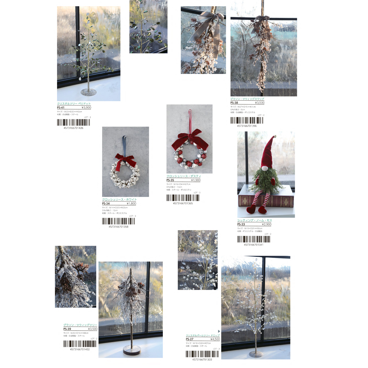 | サイズ | PS-27 クリスタルパールツリー ドロップ : W18×D20×H57 PS-33 シッティング・ノーム・モス : W19×D21×H55 PS-34 クロッシュリース・ホワイト : W14×D3.5×H23 PS-35 クロッシュリース・ダスティ : W16×D4×H27 PS-38 グラソン・ツウィッグスワッグ : W27×D15×H61 PS-39 グラソン・ツウィッグツリー : W23×D16×H48 PS-41 ジェムツリー・ペリドット : W23×D23×H42 PS-28 クリスタルパールツリーS : W20×D17×H42 PS-29 クリスタルパールツリーL : W37×D23×H62 PS-36 ポインテッドツリー・ショート : W8×D8×H42 PS-37 ポインテッドツリー・トール : W9×D9×H51 PS-40 ホワイトオウル・マトリョーナ : W7×D7×H13.5 PY-18 LEDスティツリーONM : W6×D6×H9.5 |