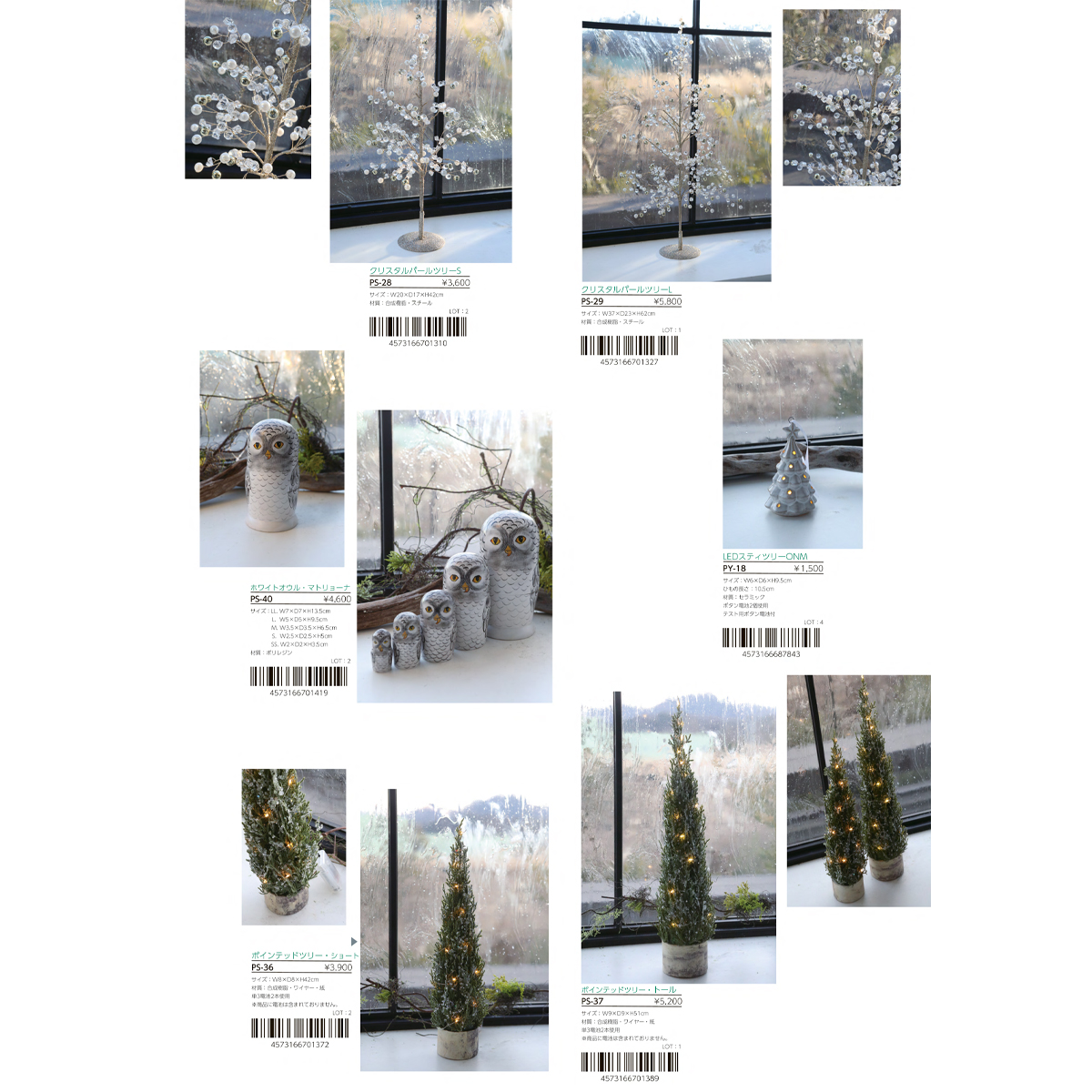 | 素材 | PS-27 クリスタルパールツリー ドロップ : 合成樹脂・スチール PS-33 シッティング・ノーム・モス : ポリエステル・合成樹脂 PS-34 クロッシュリース・ホワイト : スチール・ポリエステル PS-35 クロッシュリース・ダスティ : スチール・ポリエステル PS-38 グラソン・ツウィッグスワッグ : 合成樹脂 PS-39 グラソン・ツウィッグツリー : 合成樹脂・スチール PS-41 ジェムツリー・ペリドット : 合成樹脂・スチール PS-28 クリスタルパールツリーS : 合成樹脂・スチール PS-29 クリスタルパールツリーL : 合成樹脂・スチール PS-36 ポインテッドツリー・ショート : 合成樹脂・ワイヤー PS-37 ポインテッドツリー・トール : 合成樹脂・ワイヤー PS-40 ホワイトオウル・マトリョーナ : ポリレジン PY-18 LEDスティツリーONM : セラミック |