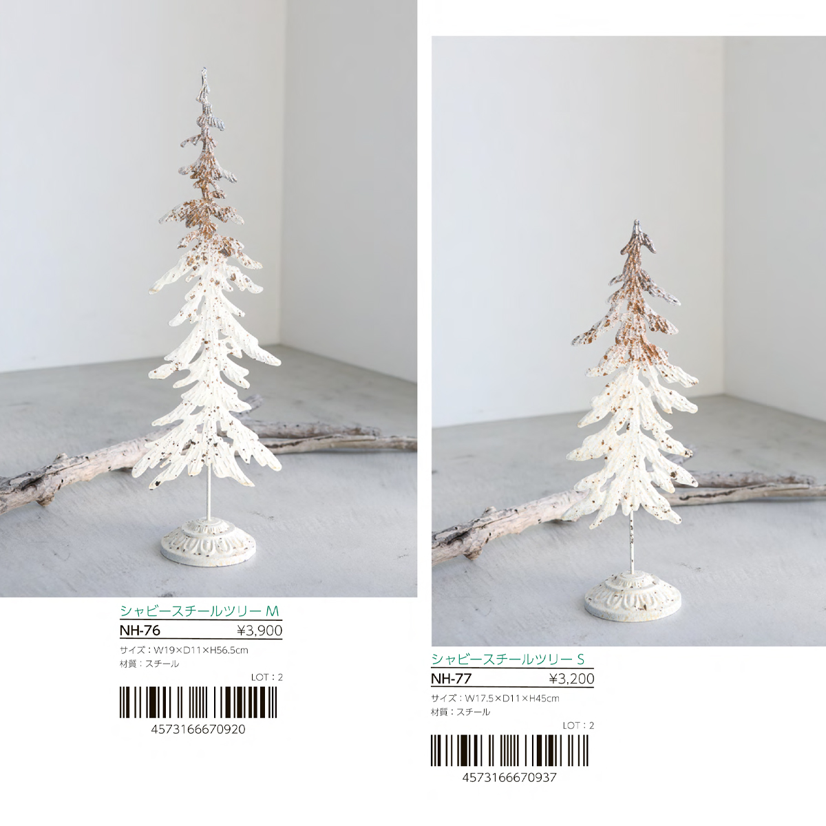 | サイズ | NH-76 シャビースチールツリー M : W19×D11×H56.5 NH-77 シャビースチールツリー S : W17.5×D11×H45 |