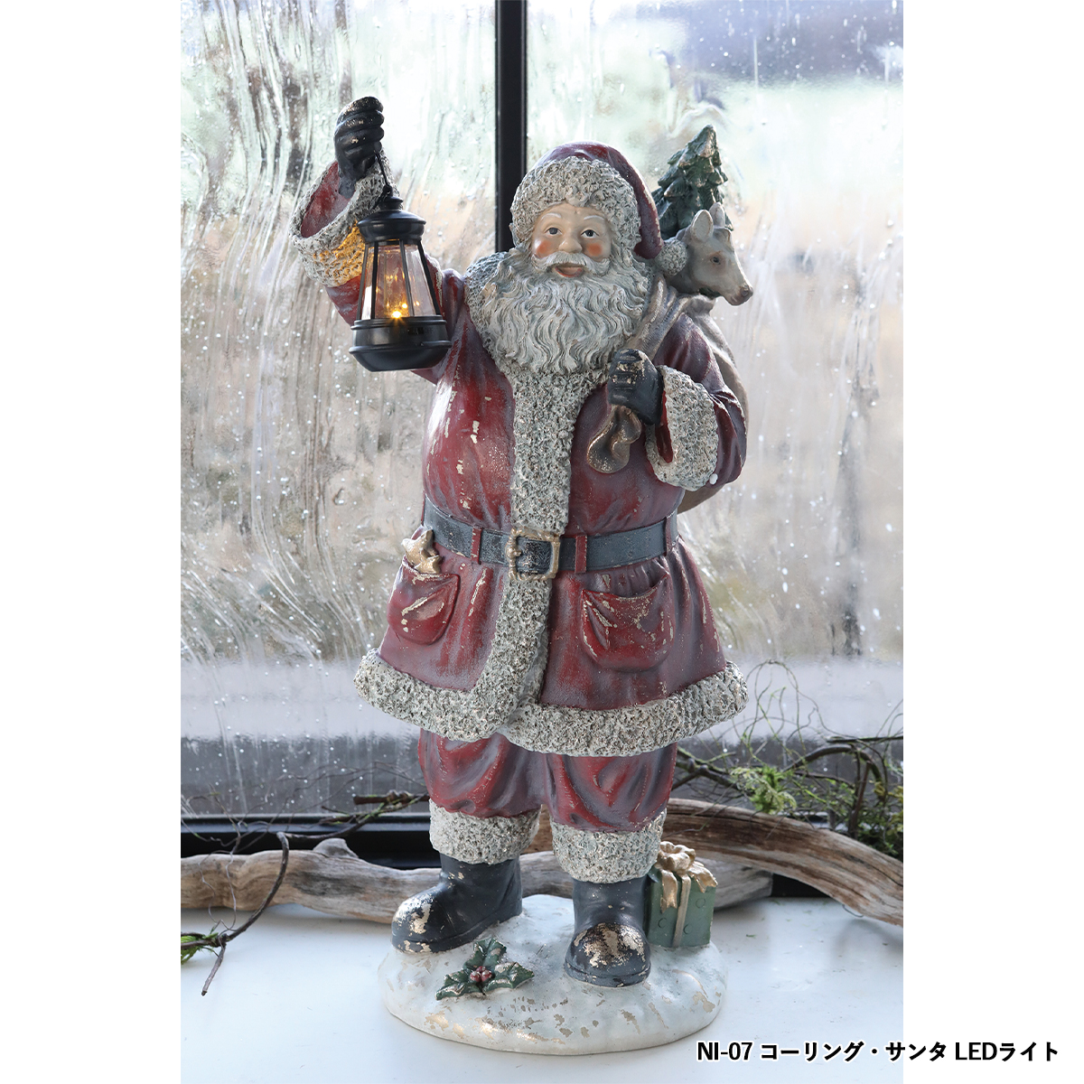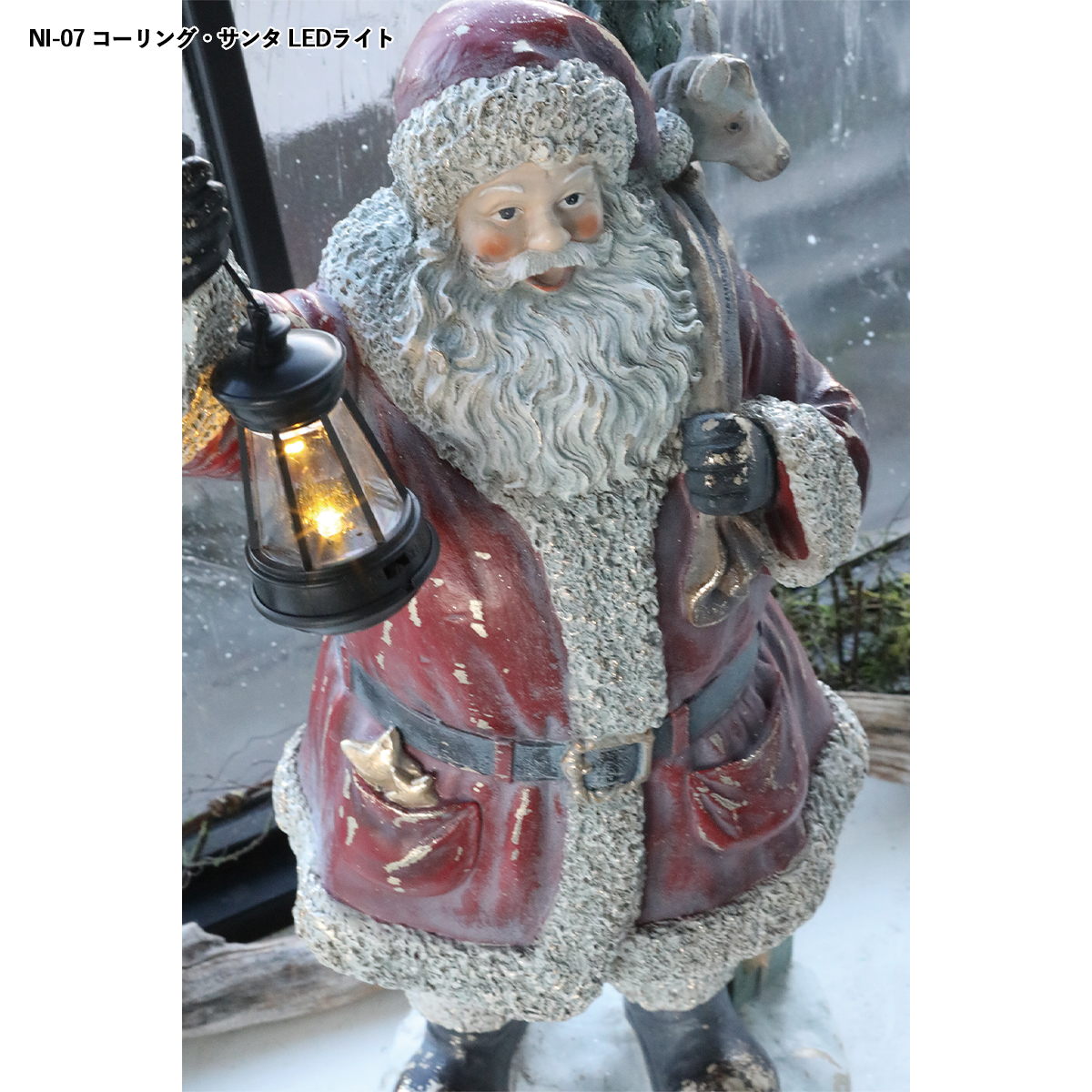 ポリレジン製のランタンを持つサンタクロースの置き飾りです。LEDライト付き。※テスト用ボタン電池付。ボタン電池2個使用(電池別売)