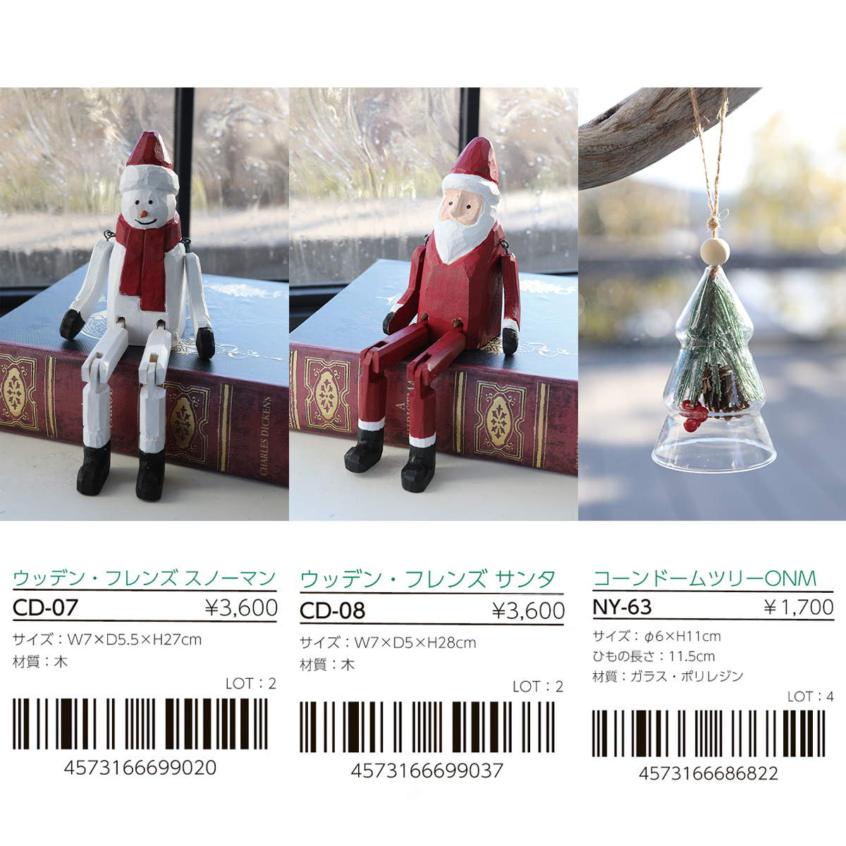 | サイズ | 【スノーマン】 W7×D5.5×H27cm 【サンタ】 W7×D5×H28cm 【コーンドームツリーONM】 直径6×H11cm/ひもの長さ:11.5cm |