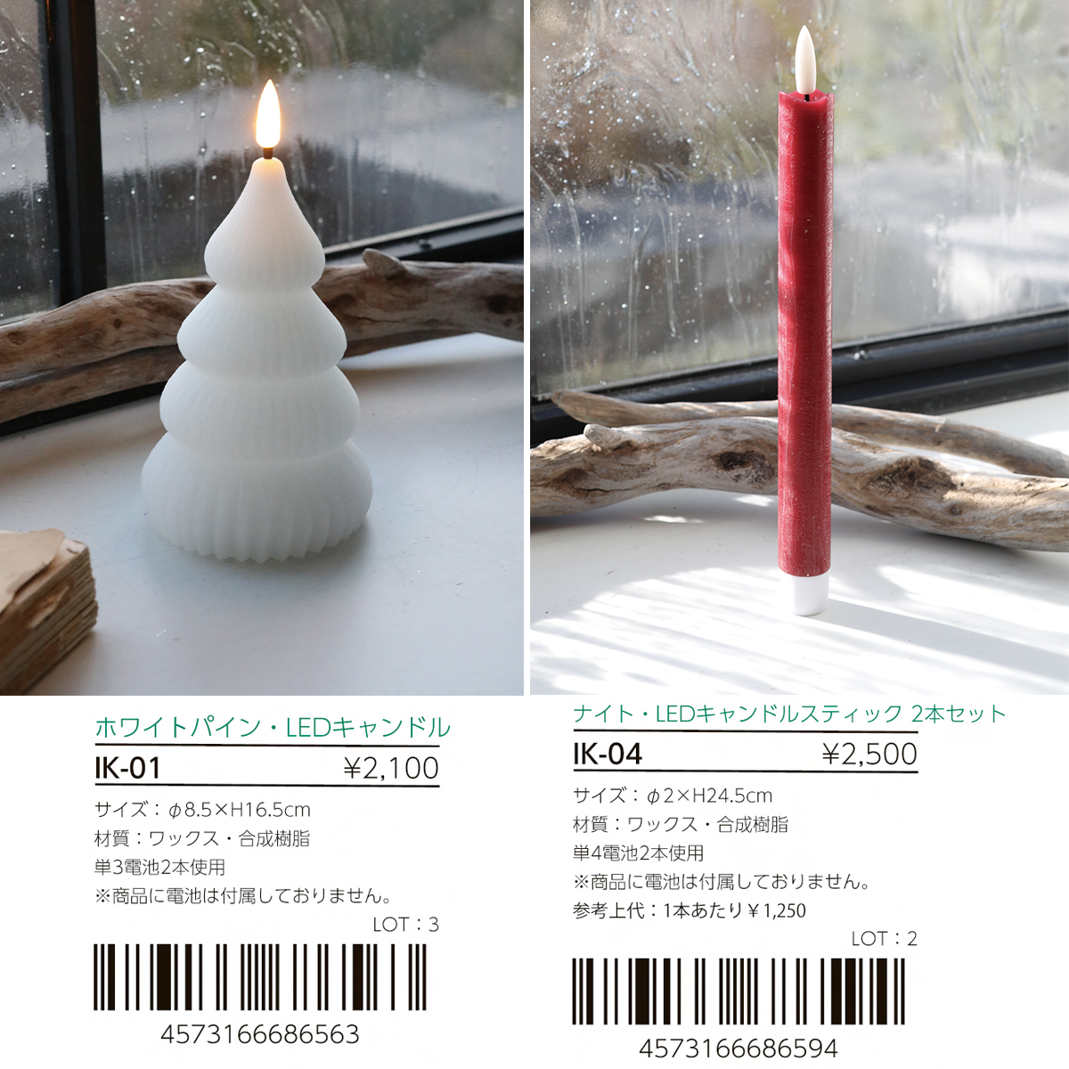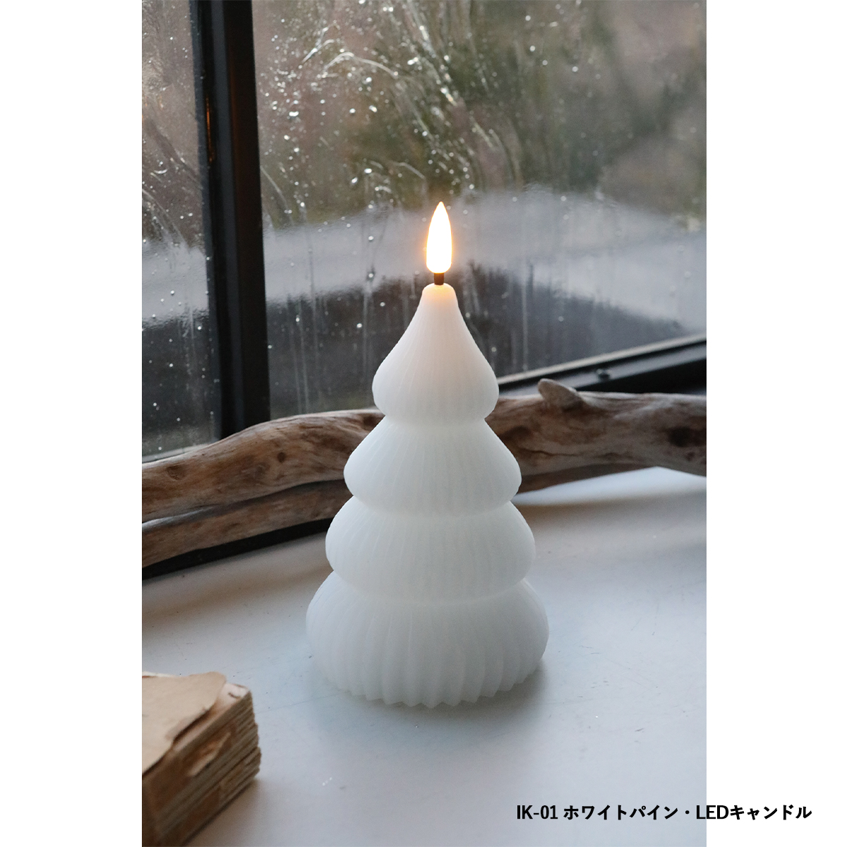 IK-01 ホワイトパイン:ワックス・合成樹脂製のクリスマスツリー型LEDキャンドルです。単3電池2本使用(電池別売)