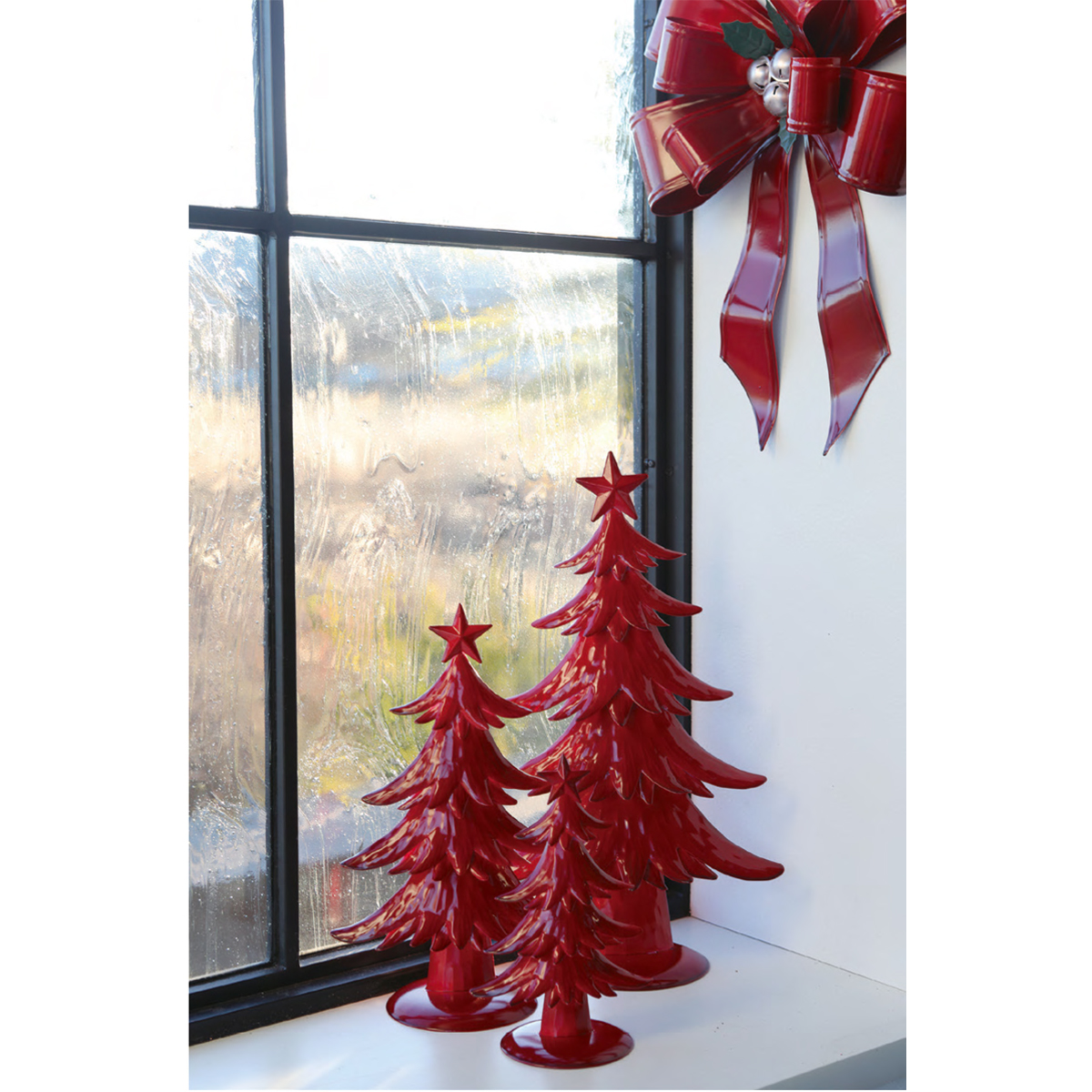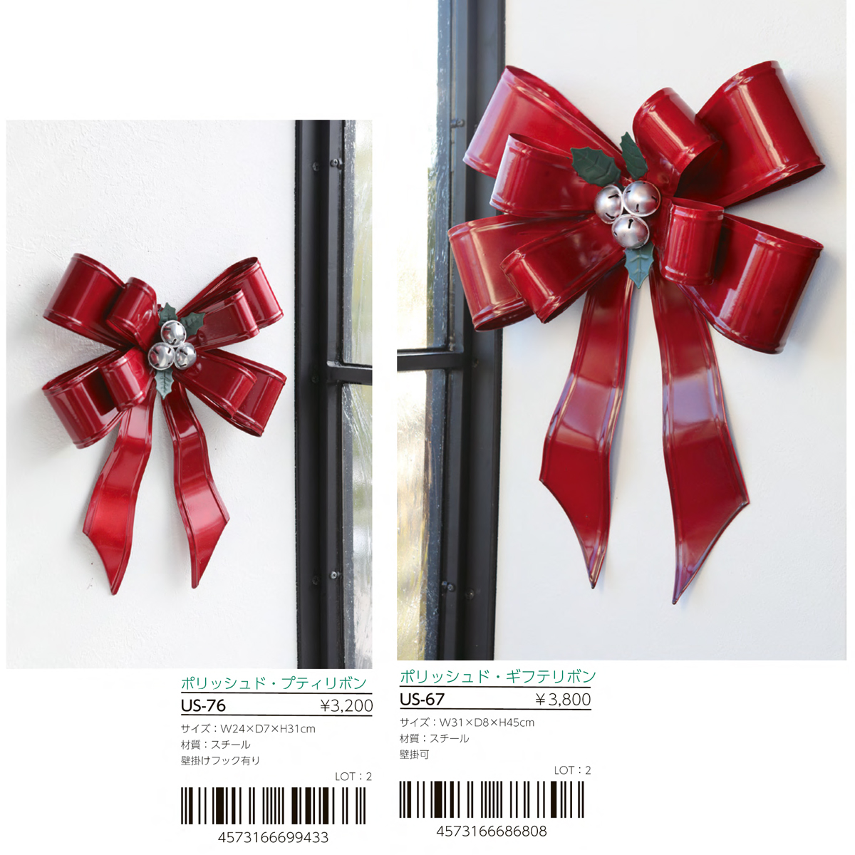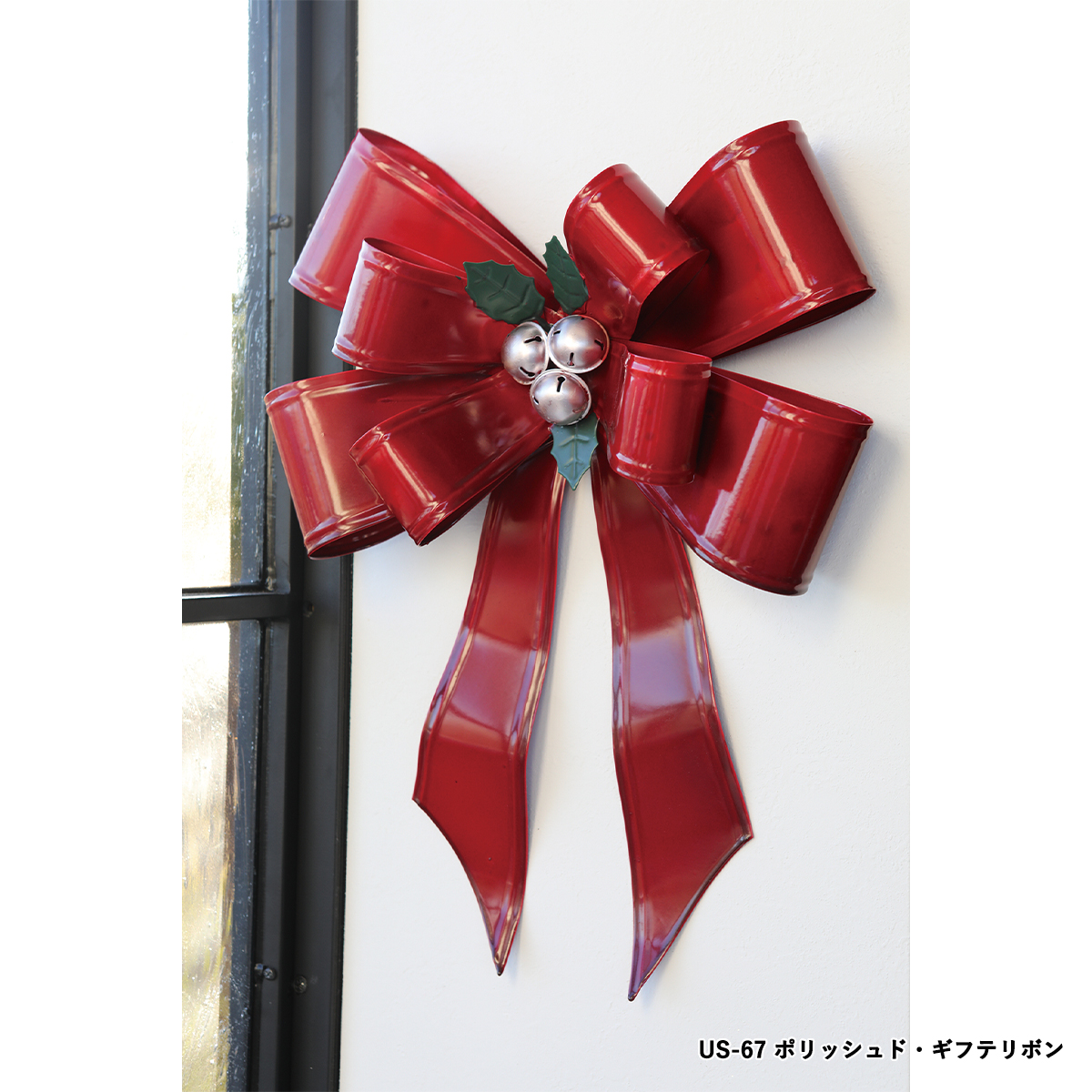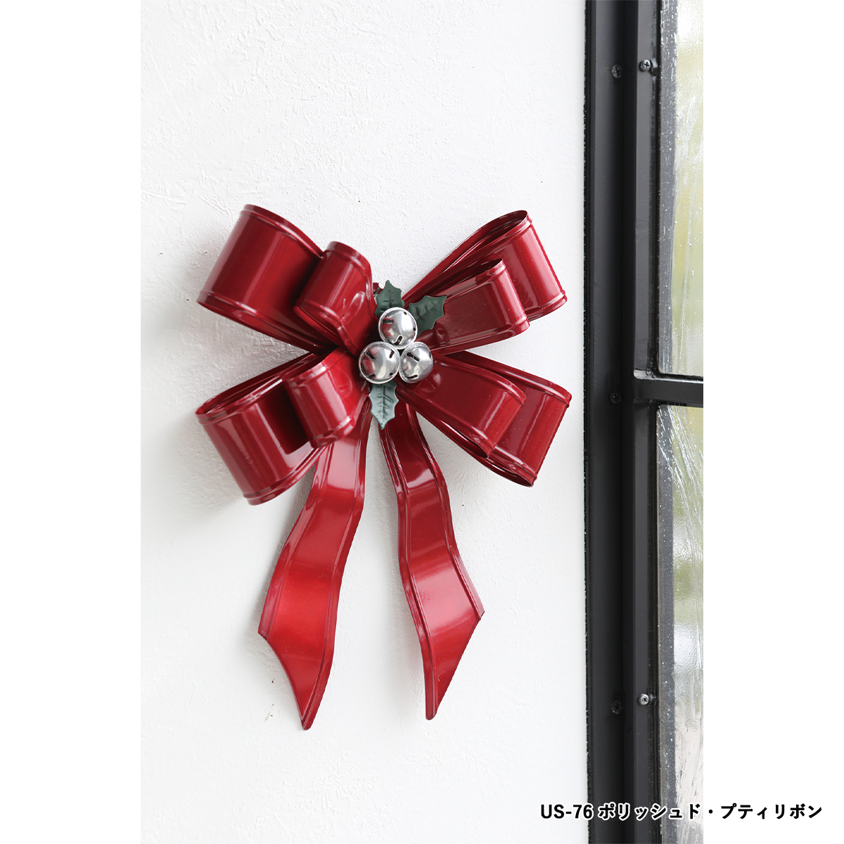 スチール製のレッドカラーのリボン型クリスマス飾りです。壁掛け可。