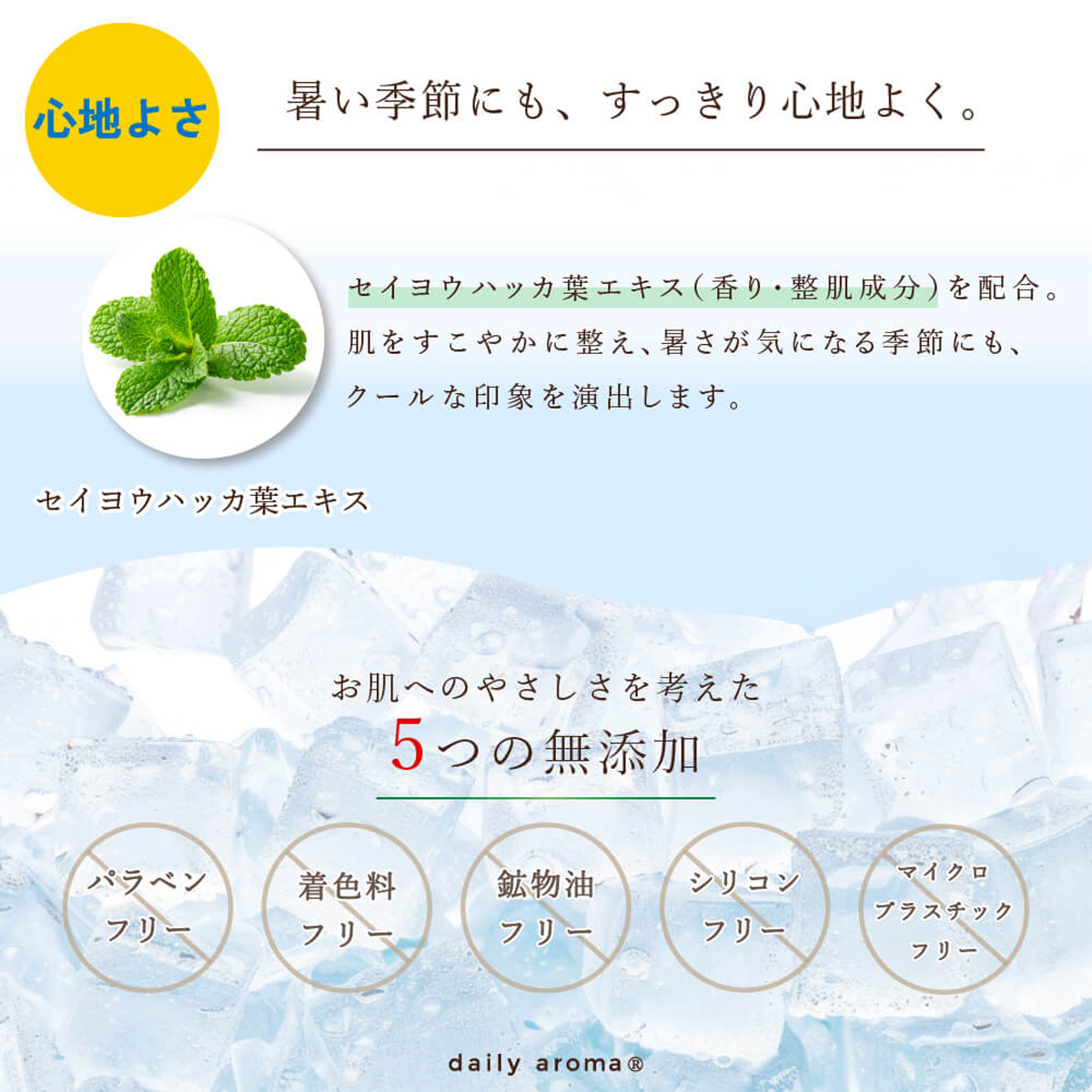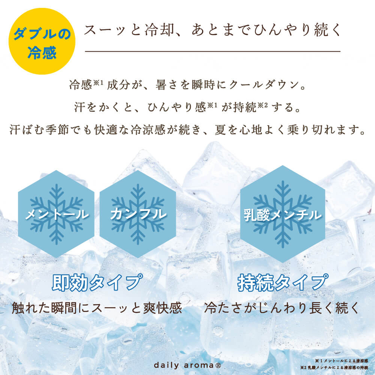爽やかな香りが汗に反応して、ひんやり成分を放出しクール感長続き。