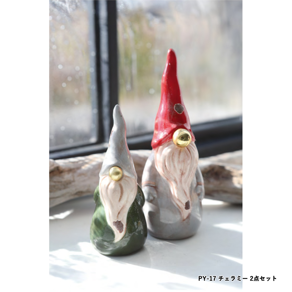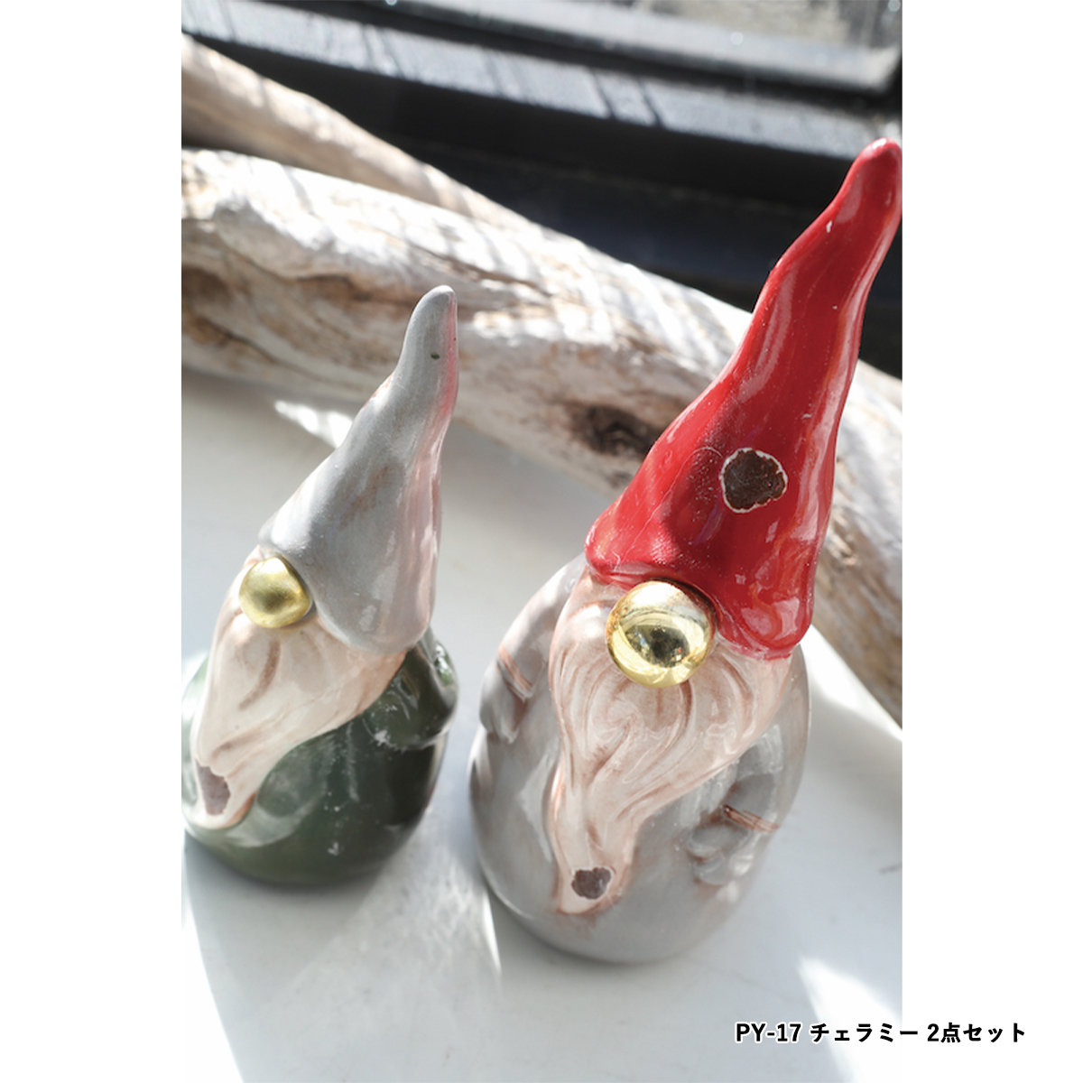 PY-17:トンテン帽をかぶったノームのセラミック製オブジェ2点セットです。