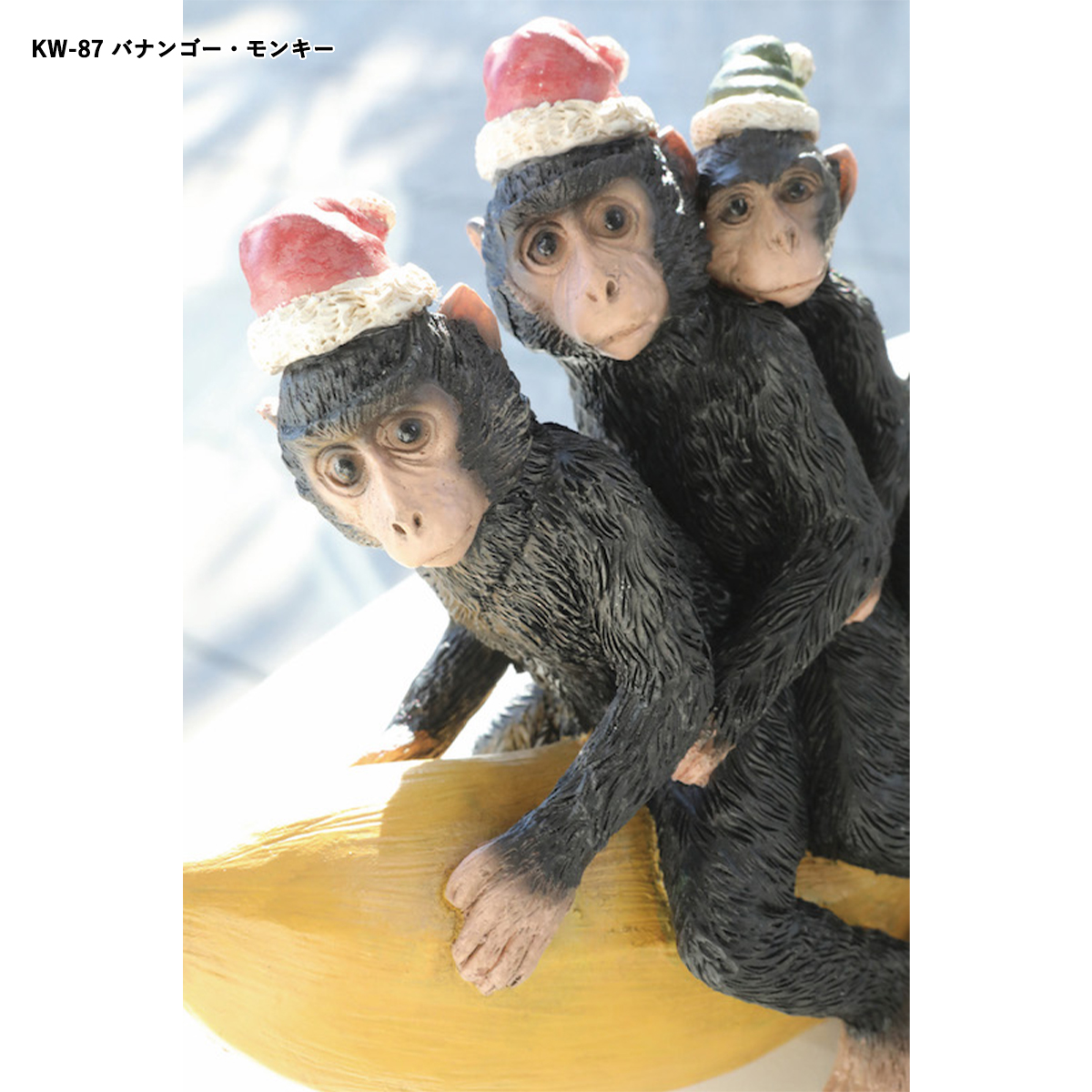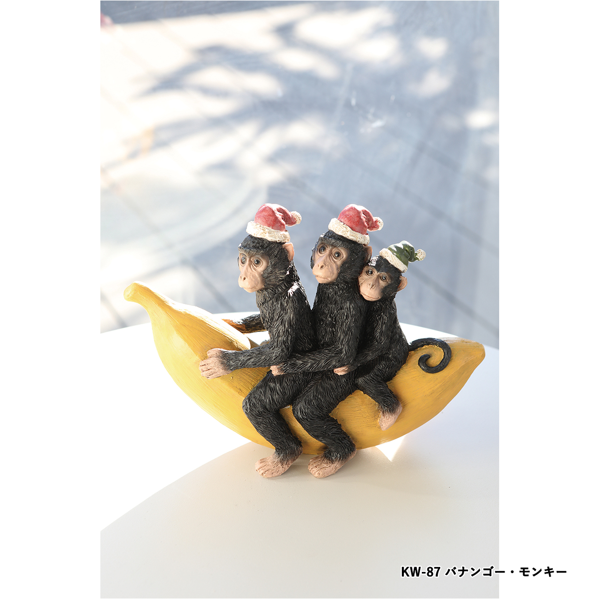 KW-87:バナナに乗ったサンタ帽のチンパンジー3体のオブジェです。