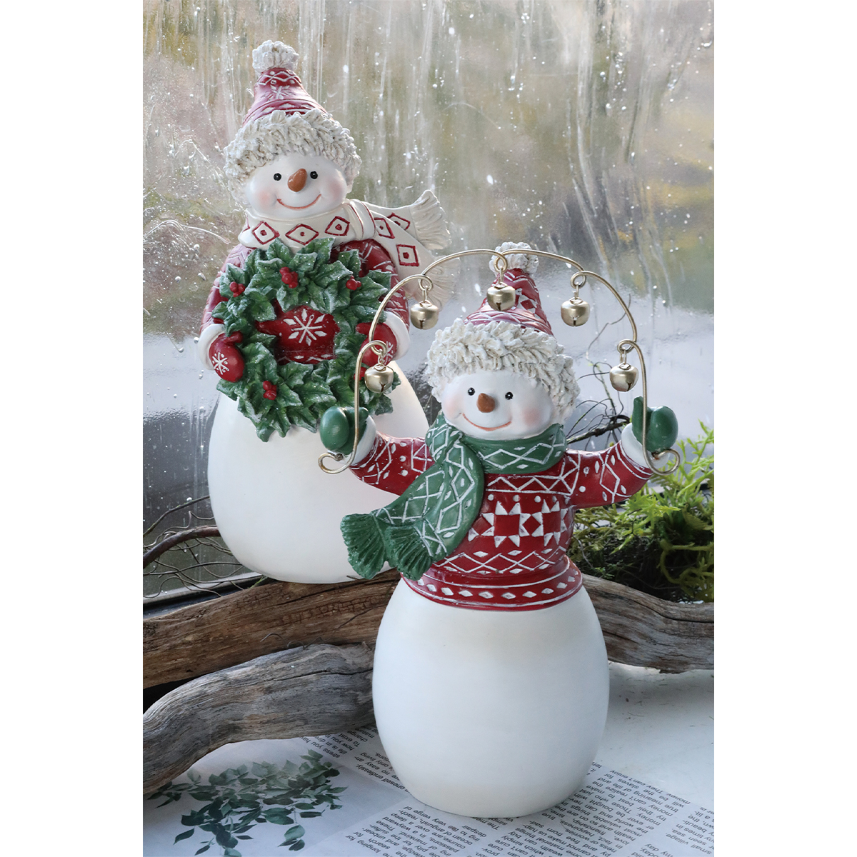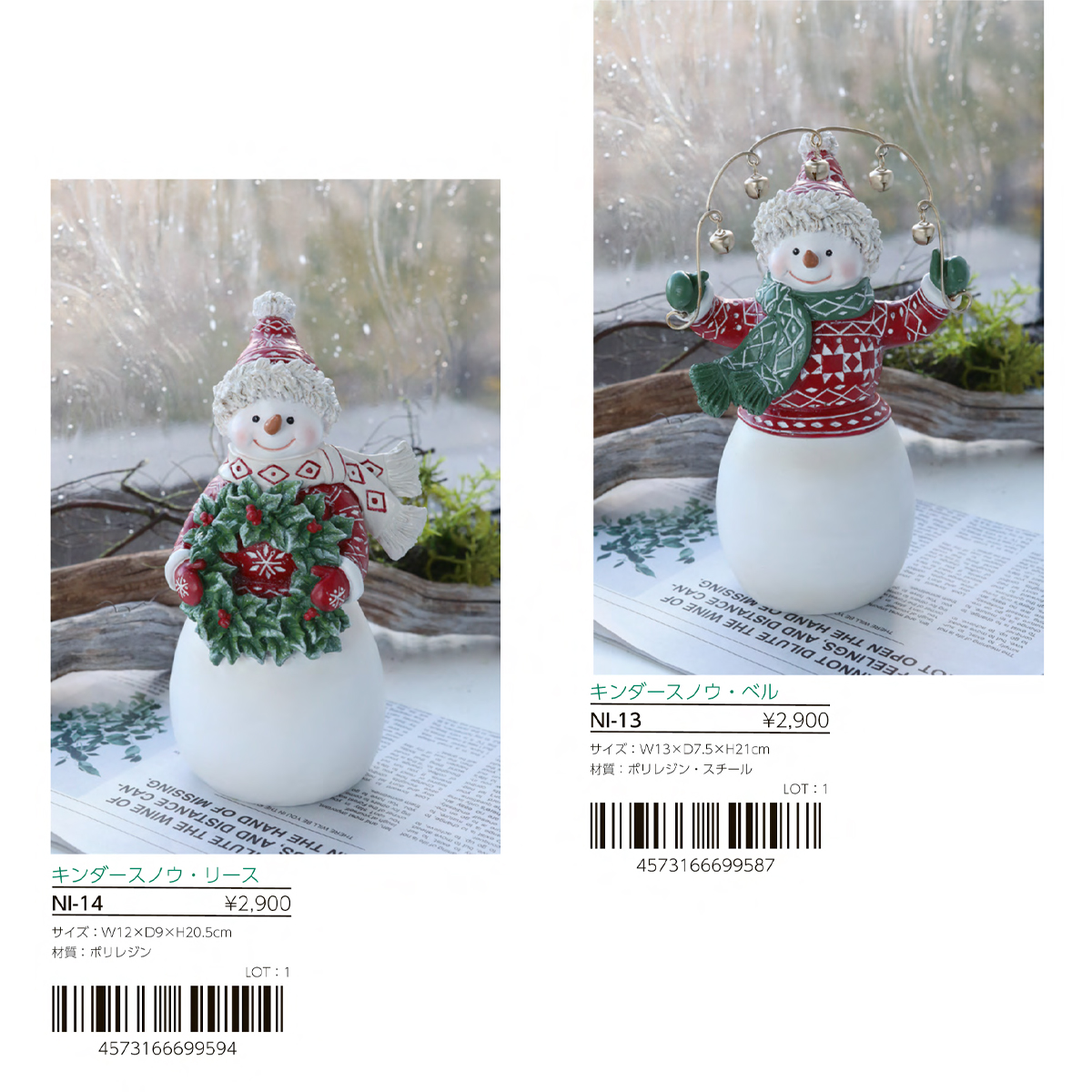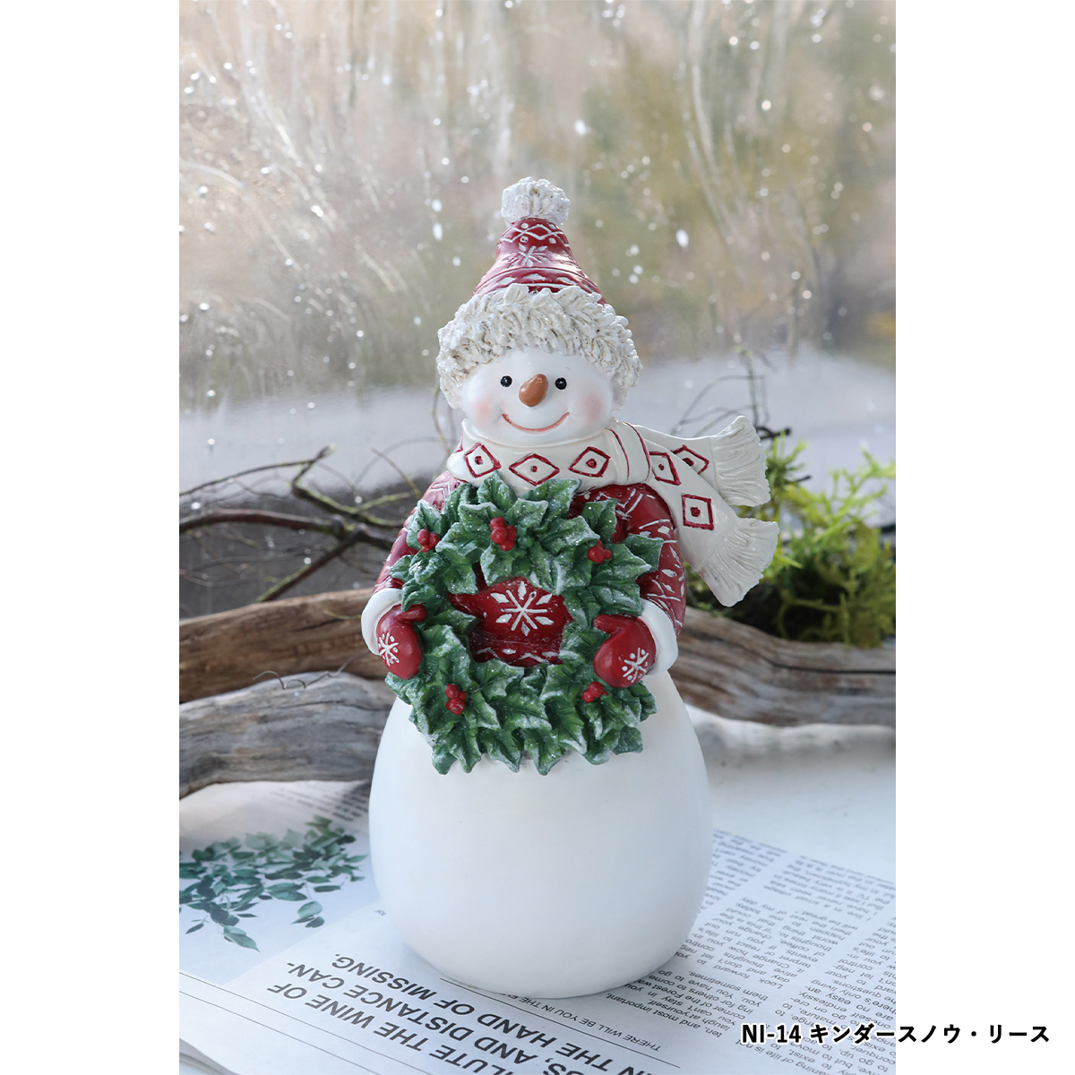 NI-14:リースを持った雪だるまのポリレジン製オブジェです。
